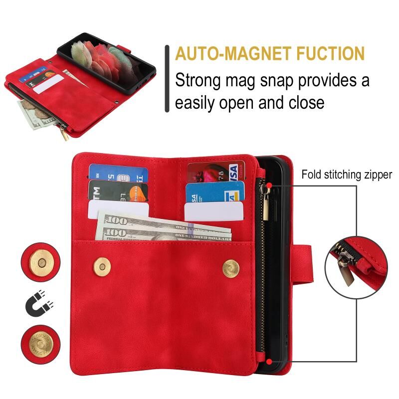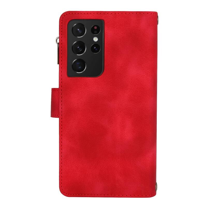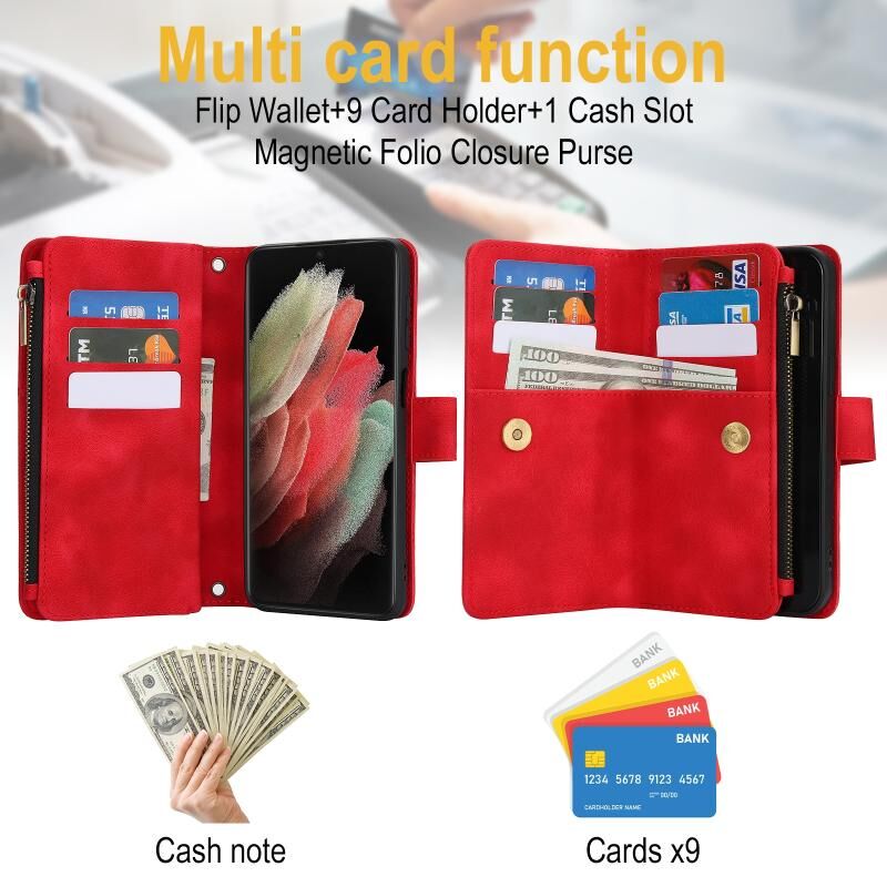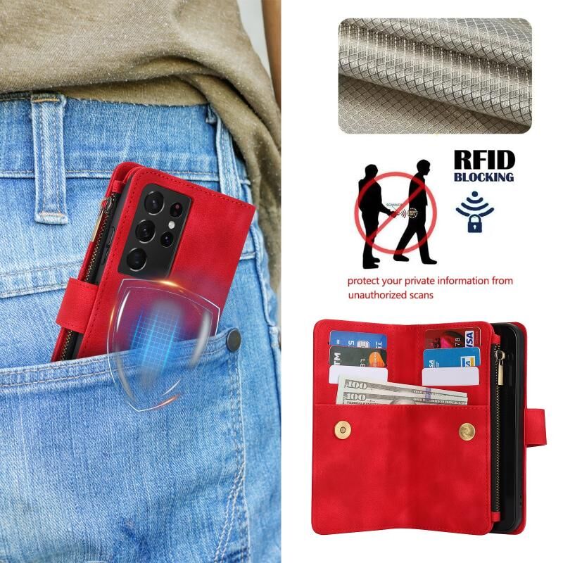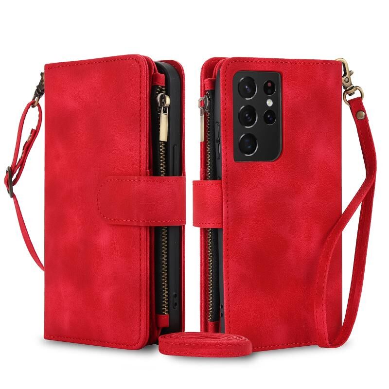 Για Samsung Galaxy S21 Ultra 5G Dream 9-κάρτα φερμουάρ πορτοφόλι RFID δερμάτινη θήκη τηλεφώνου με κορδόνι(Κόκκινο)