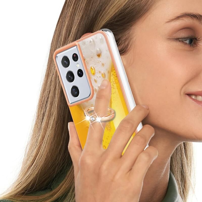 Θήκη τηλεφώνου με δακτύλιο στήριξης για Samsung Galaxy S21 Ultra 5G, με ηλεκτρολυτική επιμετάλλωση και IMD διπλής όψης (Σχέδιο Μπύρας)