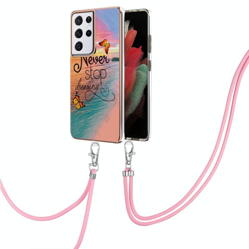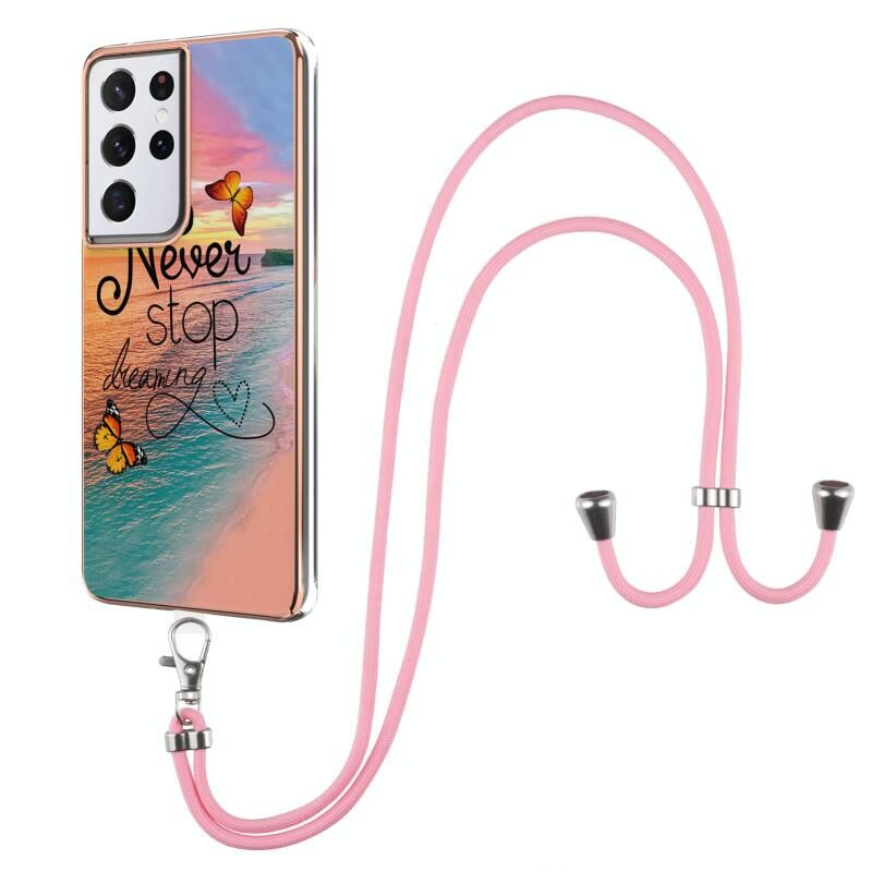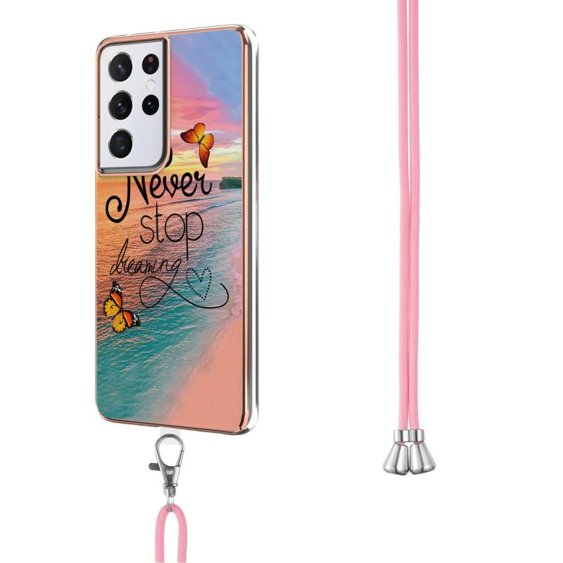 For Samsung Galaxy S21 Ultra 5G Electroplating Pattern IMD TPU Shockproof Case with Neck Lanyard(Dream Chasing Butterfly)