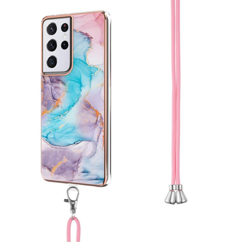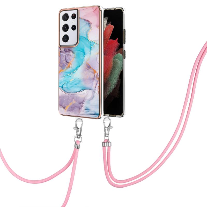 For Samsung Galaxy S21 Ultra 5G Electroplating Pattern IMD TPU Shockproof Case with Neck Lanyard(Milky Way Blue Marble)