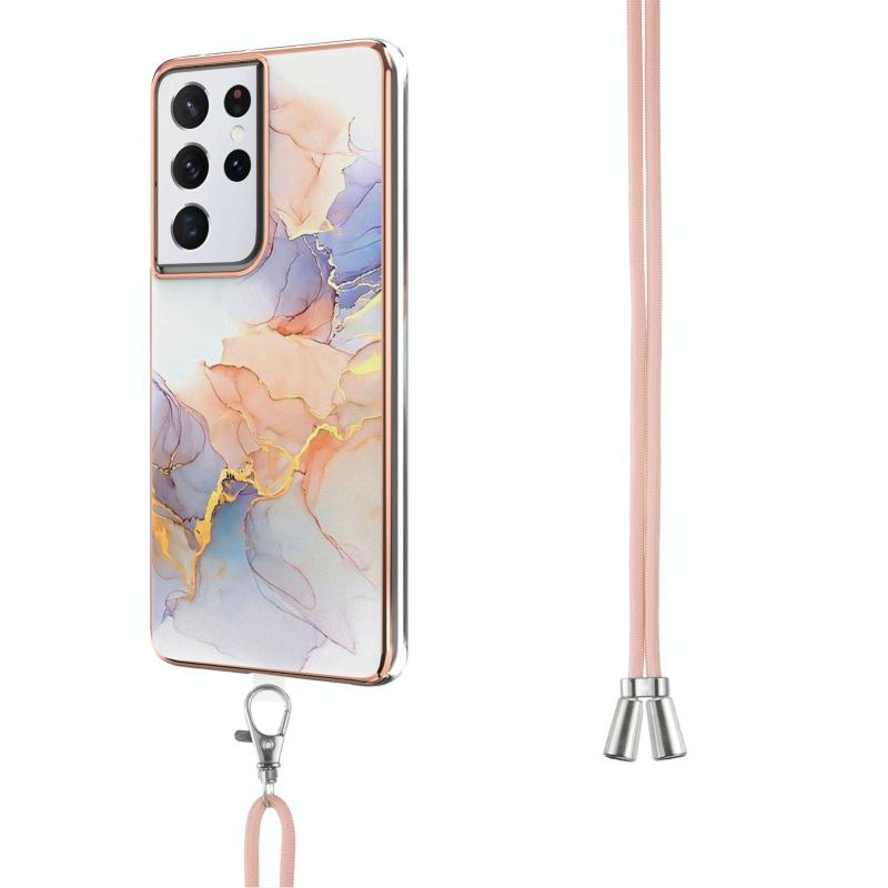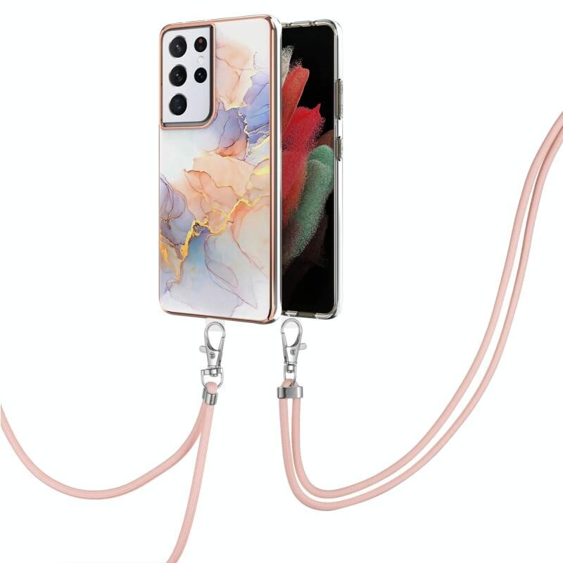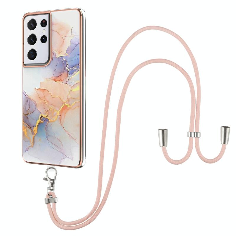 For Samsung Galaxy S21 Ultra 5G Electroplating Pattern IMD TPU Shockproof Case with Neck Lanyard(Milky Way White Marble)