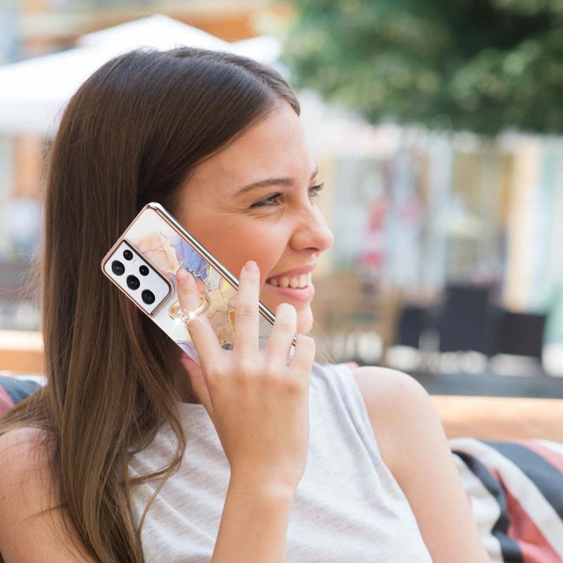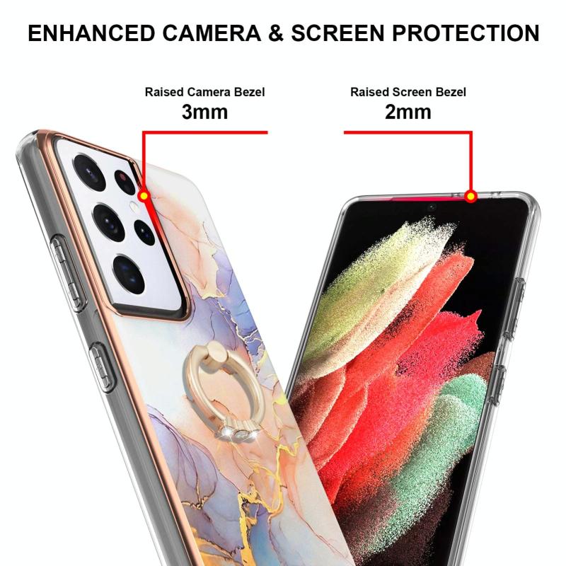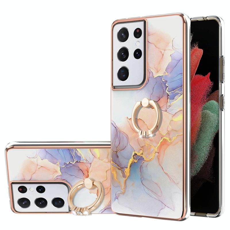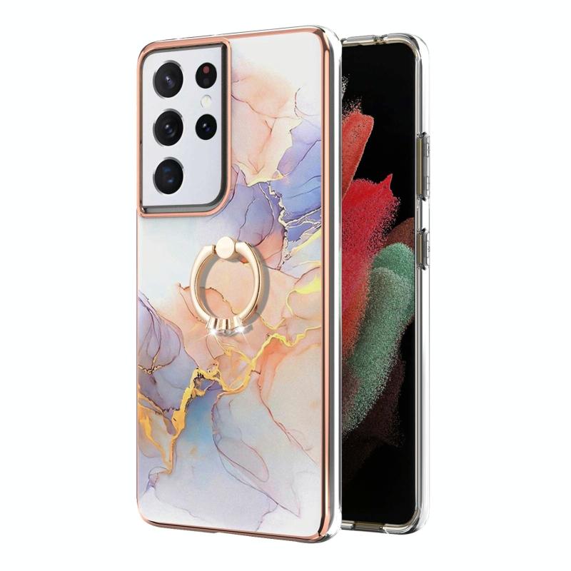 For Samsung Galaxy S21 Ultra 5G Electroplating Pattern IMD TPU Shockproof Case with Rhinestone Ring Holder(Milky Way White Marble)