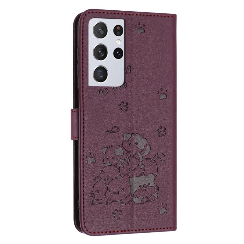 For Samsung Galaxy S21 Ultra 5G Embossed Kitten Phone Leather Case with Lanyard(Wine Red)