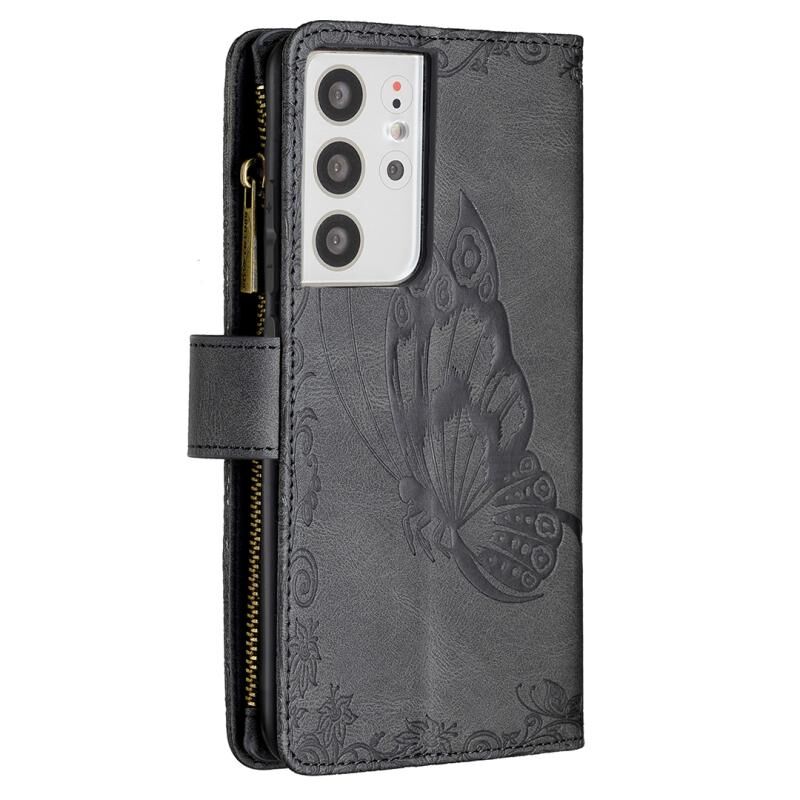 Για Samsung Galaxy S21 Ultra 5G Flying πεταλούδα ανάγλυφο μοτίβο φερμουάρ οριζόντια Flip δερμάτινη θήκη με κάτοχο & υποδοχές για κάρτες & πορτοφόλι (μαύρο)