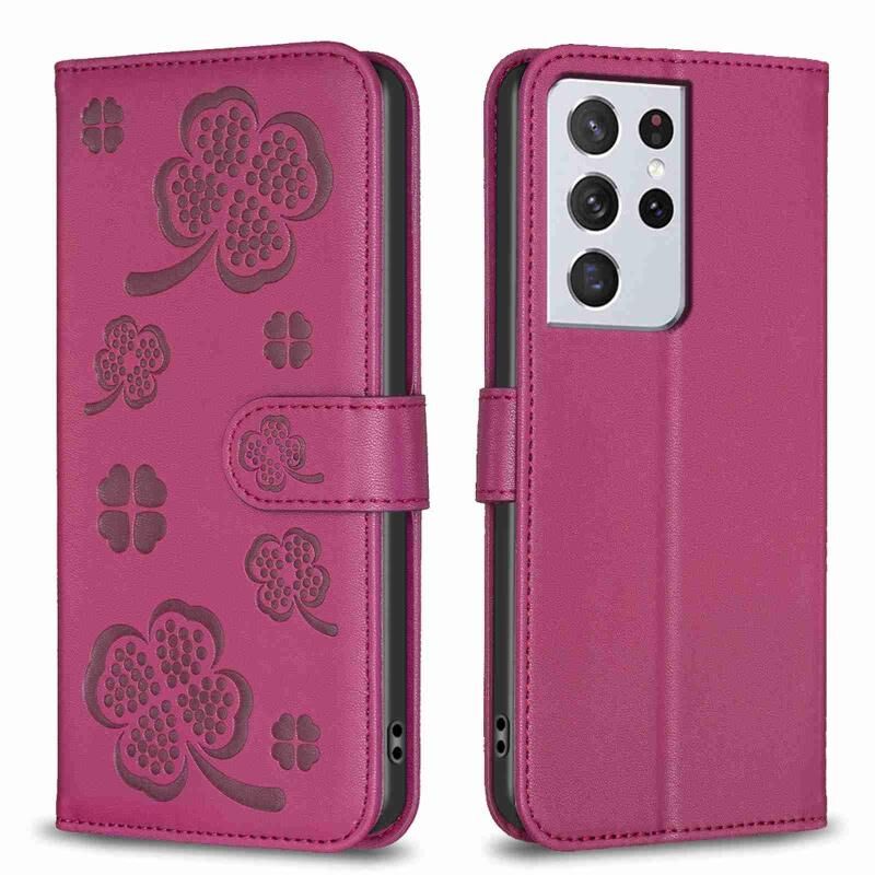 Για Samsung Galaxy S21 Ultra 5G τετράφυλλο ανάγλυφη δερμάτινη θήκη τηλεφώνου (Rose Red)