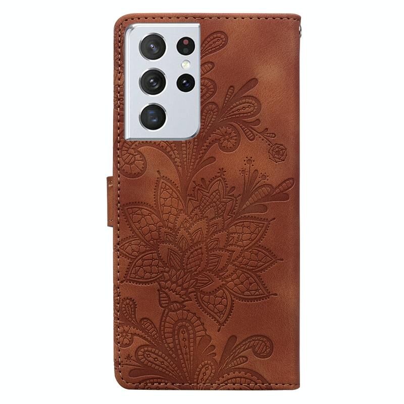 Θήκη κινητού τηλεφώνου Samsung Galaxy S21 Ultra 5G από PU με δαντελένιο λουλουδάτο ανάγλυφο και μαγνητικό κούμπωμα, με λουρί καρπού (Πράσινο)