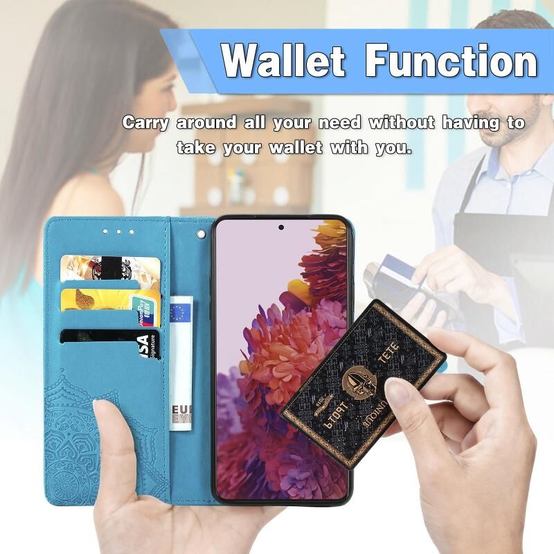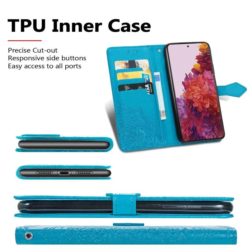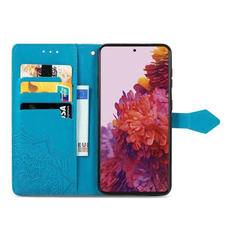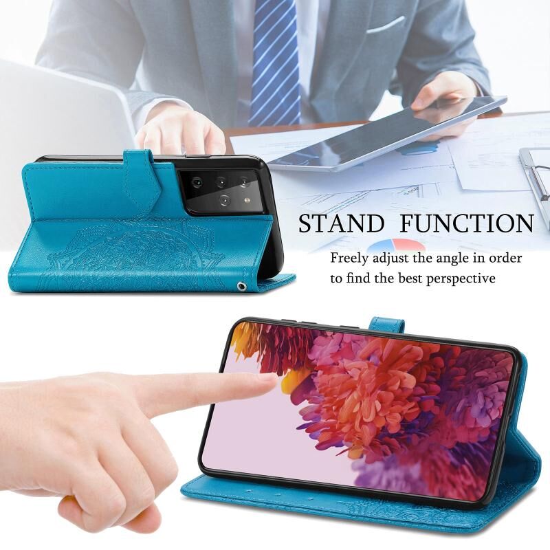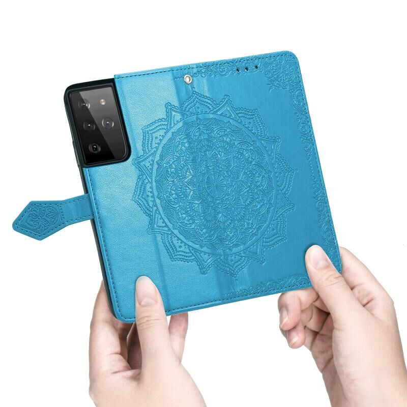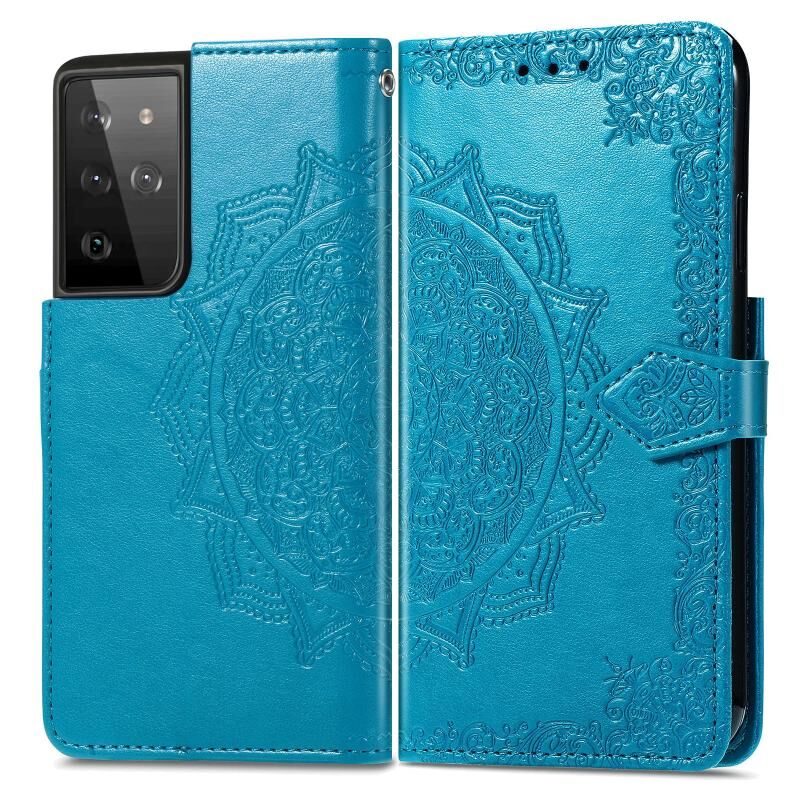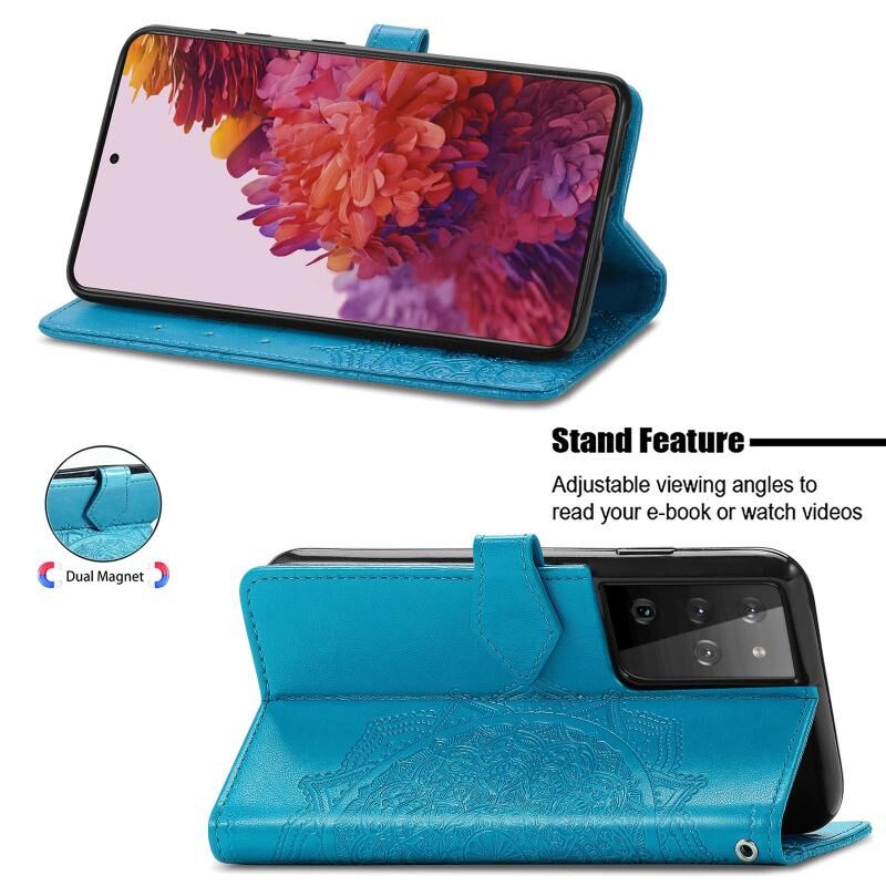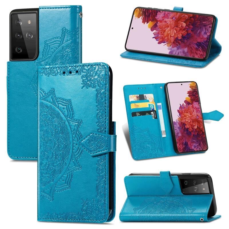 Θήκη Samsung Galaxy S21 Ultra 5G, Δερμάτινη οριζόντια με σχέδιο Mandala, ανάγλυφο λουλουδιού, με βάση στήριξης, τρεις θήκες για κάρτες, πορτοφόλι & λουρί (Μαύρο)