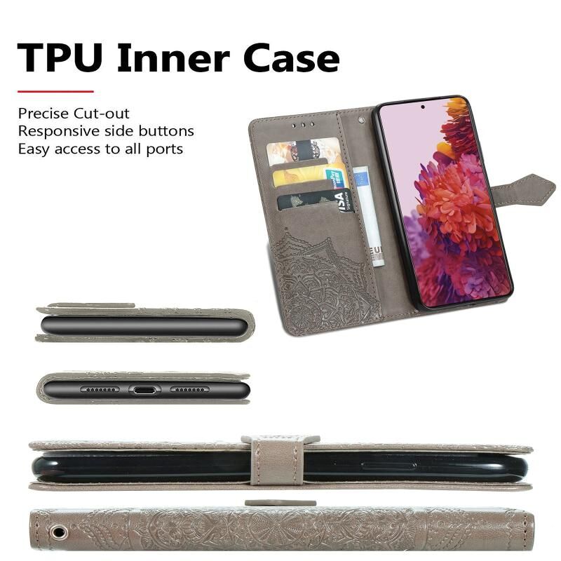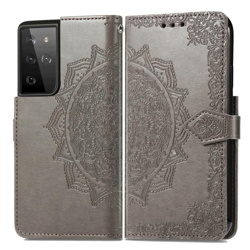 Θήκη Samsung Galaxy S21 Ultra 5G, Δερμάτινη οριζόντια με σχέδιο Mandala, ανάγλυφο λουλουδιού, με βάση στήριξης, τρεις θήκες για κάρτες, πορτοφόλι & λουρί (Μαύρο)