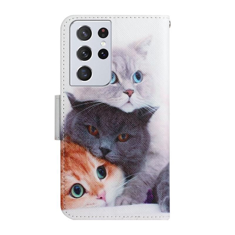 Θήκη δέρματος οριζόντιας αναδίπλωσης με σχέδιο ζωγραφικής για Samsung Galaxy S21 Ultra 5G με βάση & υποδοχή κάρτας & πορτοφόλι (Τρία Γατάκια)