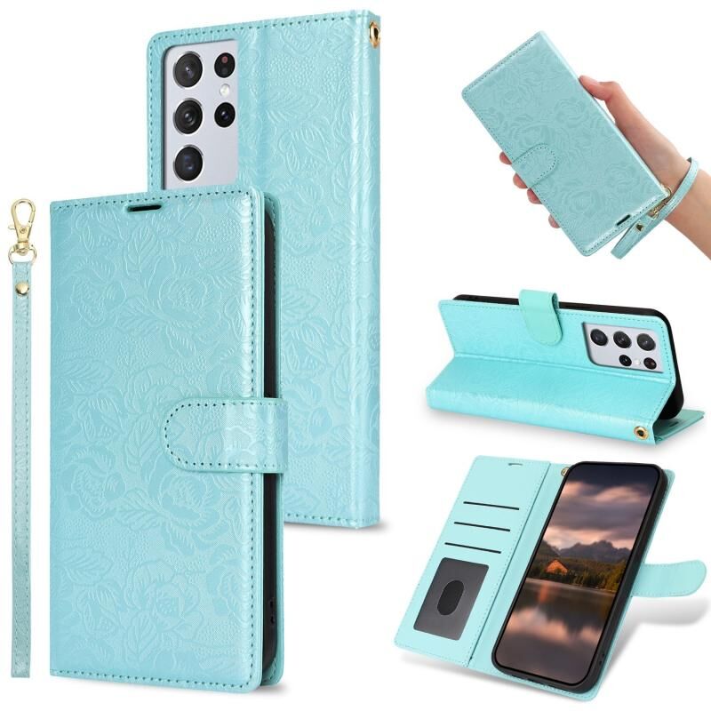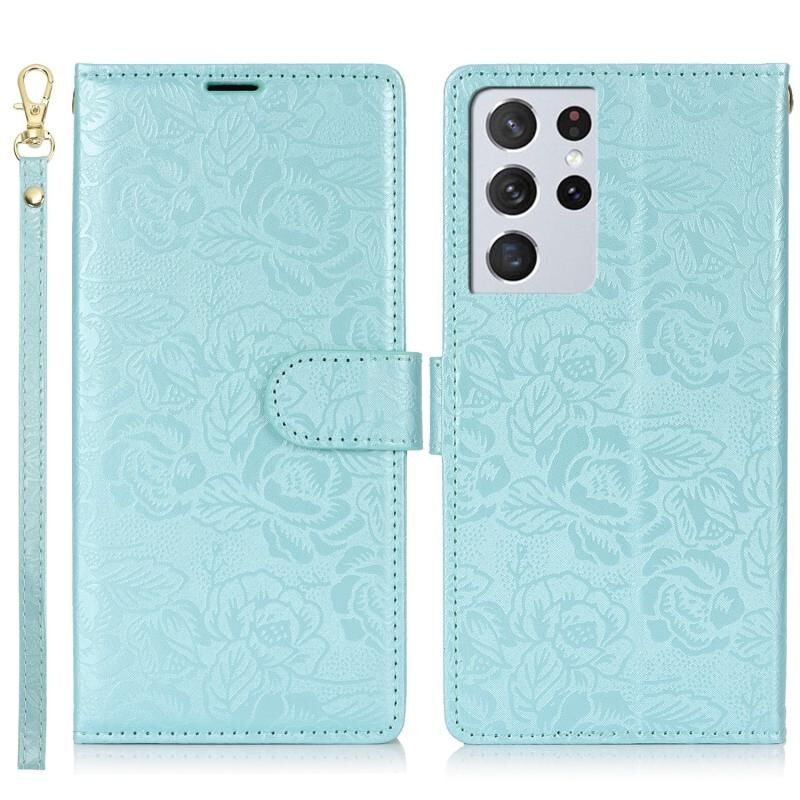 For Samsung Galaxy S21 Ultra 5G Peony Flowers Imprint Leather Phone Case(Sky Blue)