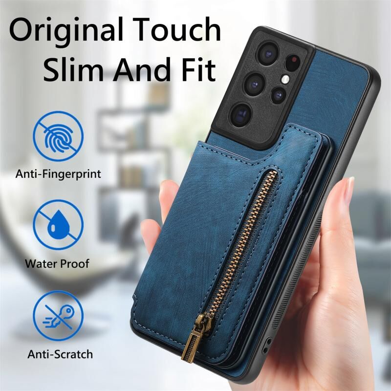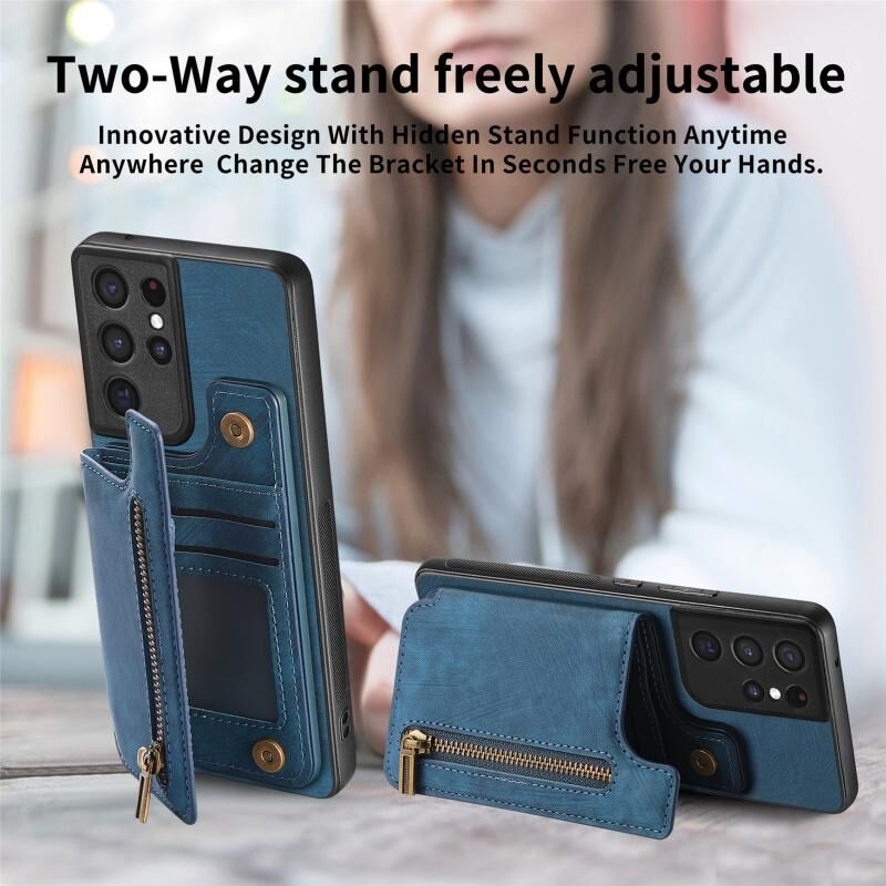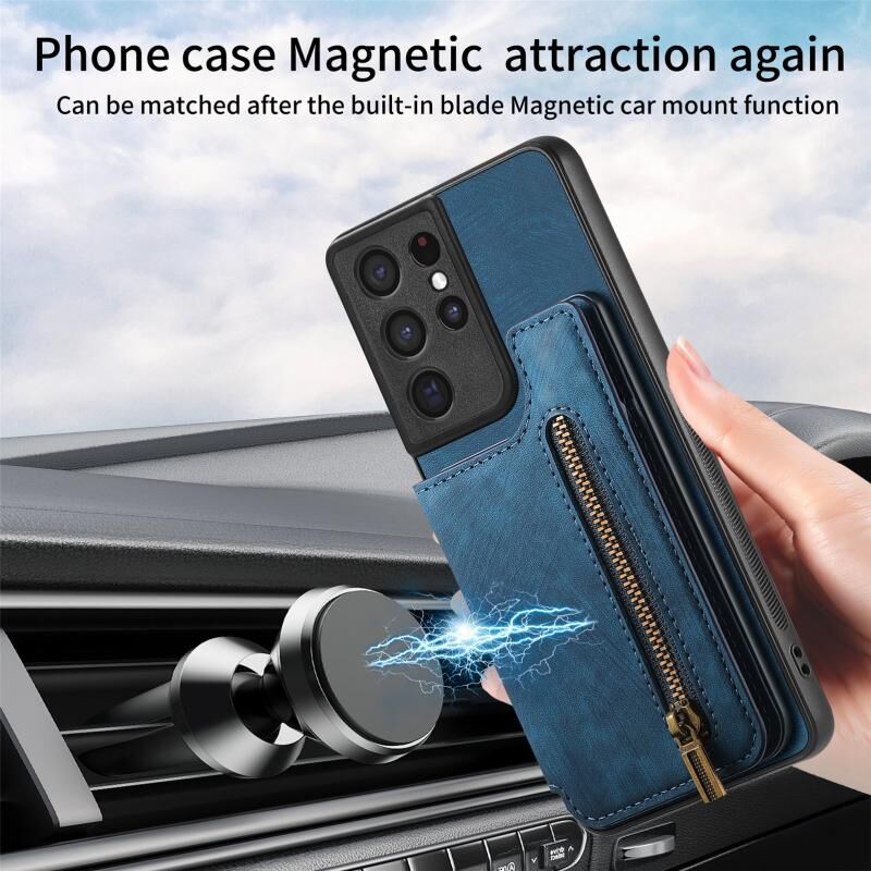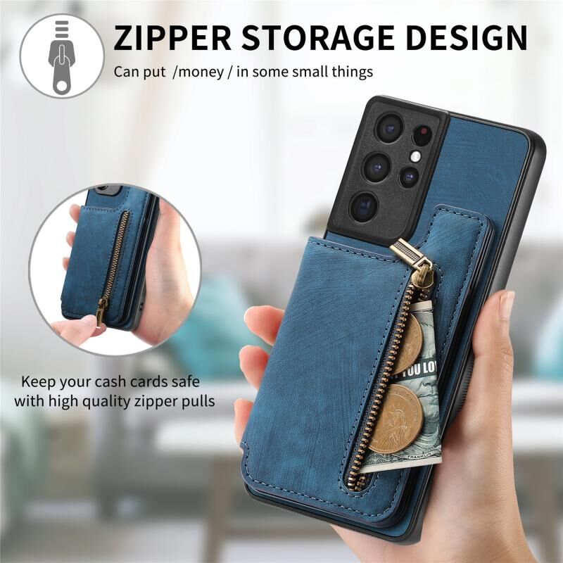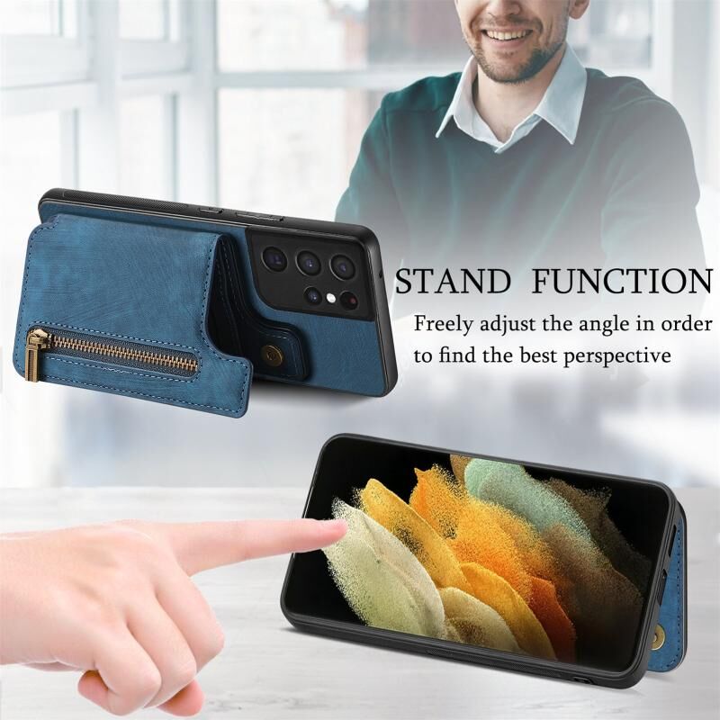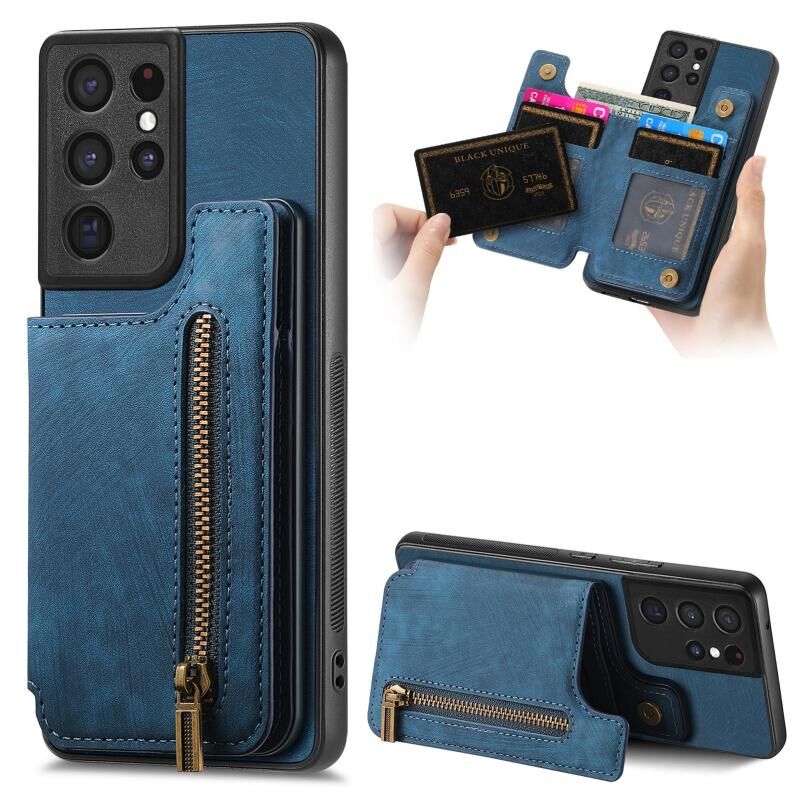 Για Samsung Galaxy S21 Ultra 5G Retro δέρμα φερμουάρ πορτοφόλι πίσω θήκη τηλεφώνου (μπλε)
