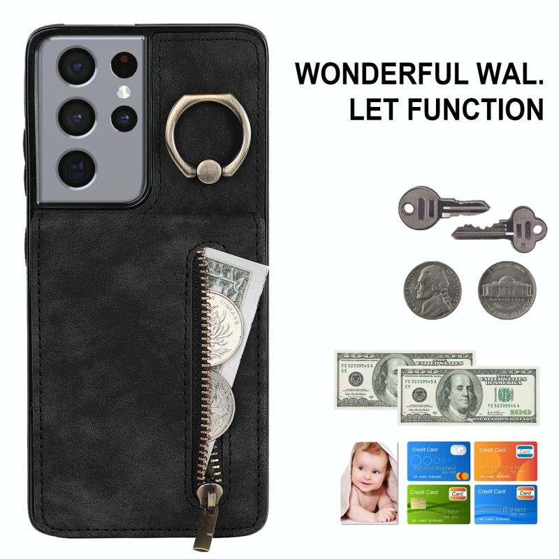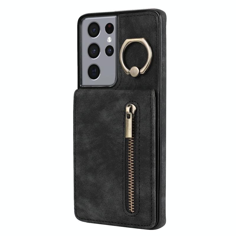 Θήκη κινητού τηλεφώνου Samsung Galaxy S21 Ultra 5G με ρετρό δακτύλιο και θήκη καρτών RFID με φερμουάρ (Μαύρο)