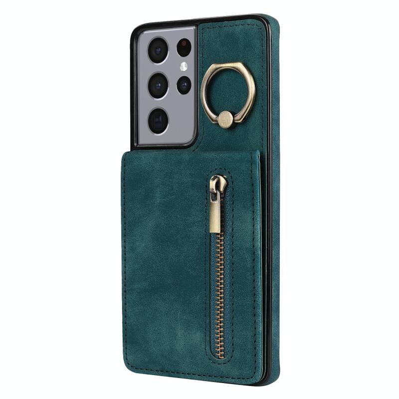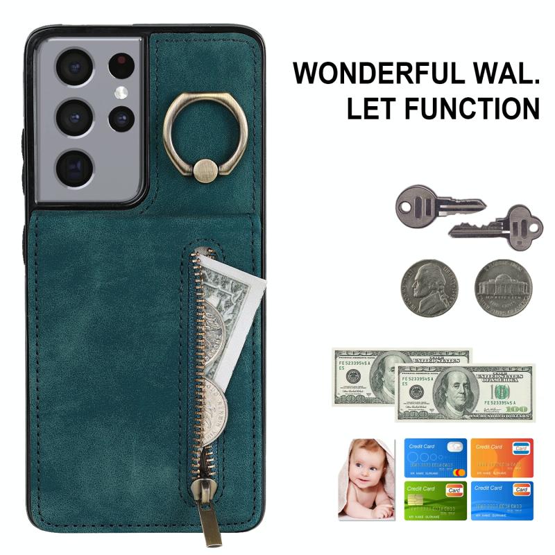 Θήκη κινητού τηλεφώνου Samsung Galaxy S21 Ultra 5G με ρετρό δακτύλιο και θήκη καρτών RFID με φερμουάρ (Μπλε)
