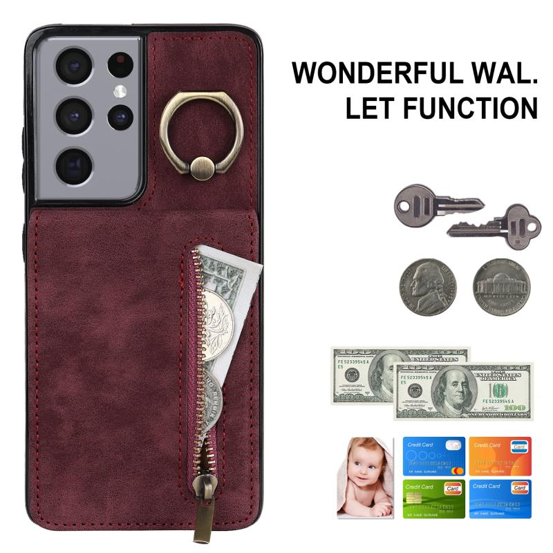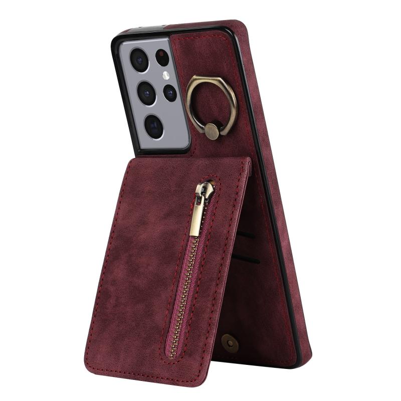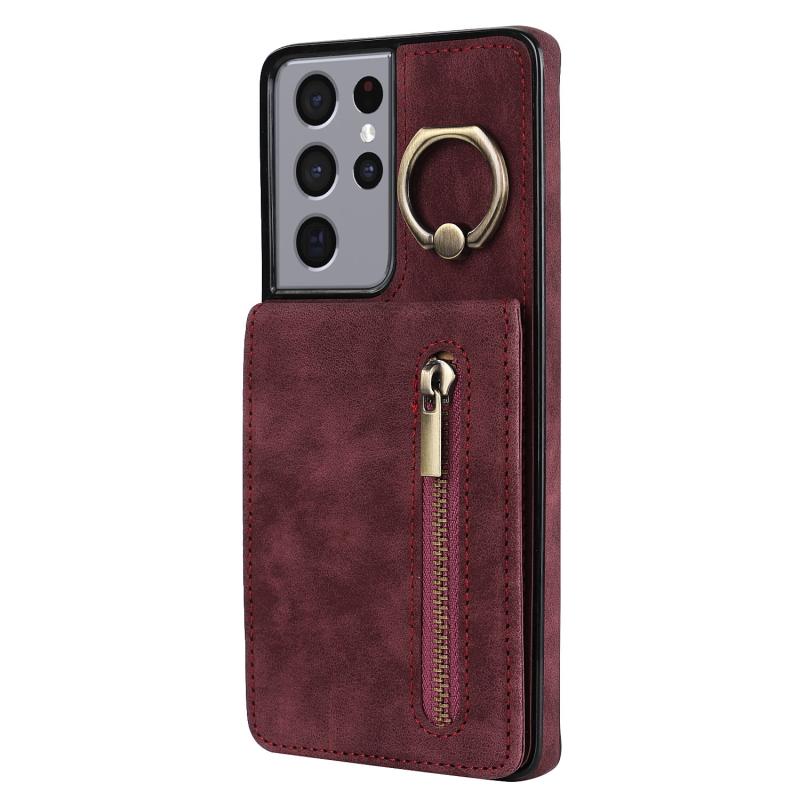 Θήκη κινητού τηλεφώνου Samsung Galaxy S21 Ultra 5G με ρετρό δακτύλιο και θήκη καρτών RFID με φερμουάρ (Κρασοκόκκινο)