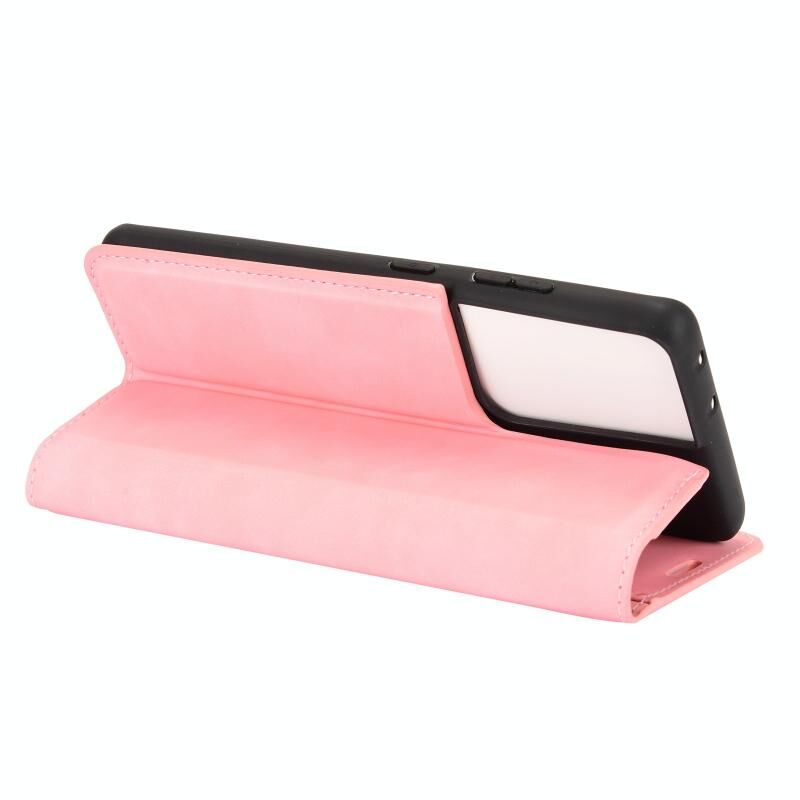 Θήκη δερμάτινη με μαγνητική απορρόφηση για Samsung Galaxy S21 Ultra 5G, σε ρετρό σχεδιασμό, ιδανική για επαγγελματική χρήση, με βάση στήριξης, θήκες για κάρτες και πορτοφόλι (ρόζ)