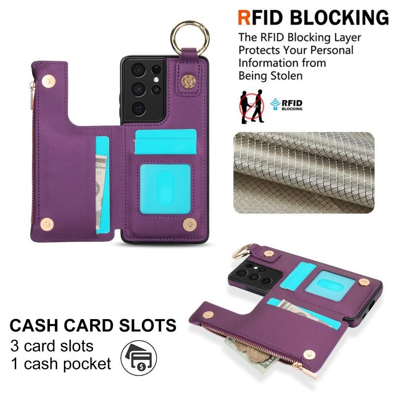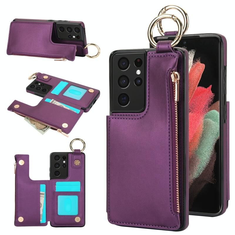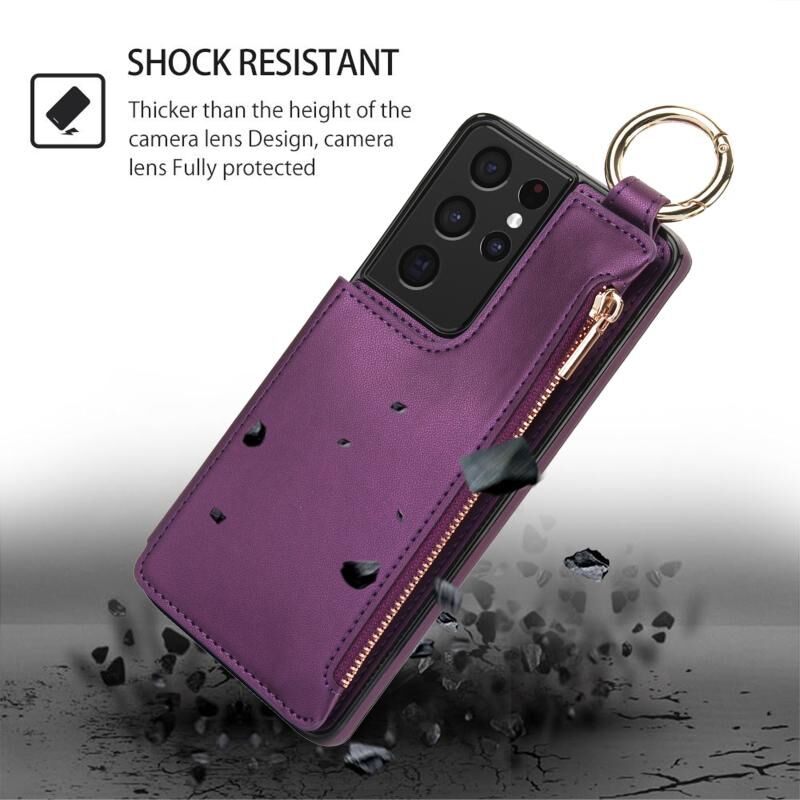 Για Samsung Galaxy S21 Ultra 5G RFlD Anti-theft Διπλό πόρπη δαχτυλίδι φερμουάρ τηλέφωνο υπόθεση κάρτα (σκούρο μωβ)