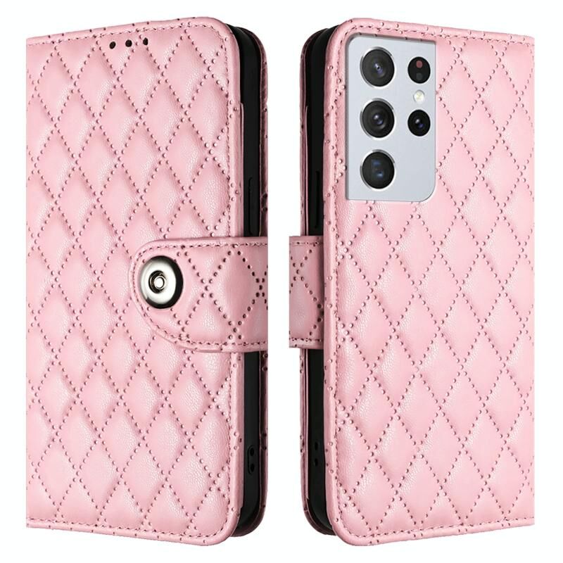 Για Samsung Galaxy S21 Ultra 5G Rhombic Texture Flip δερμάτινη θήκη τηλεφώνου με κορδόνι (ροζ)
