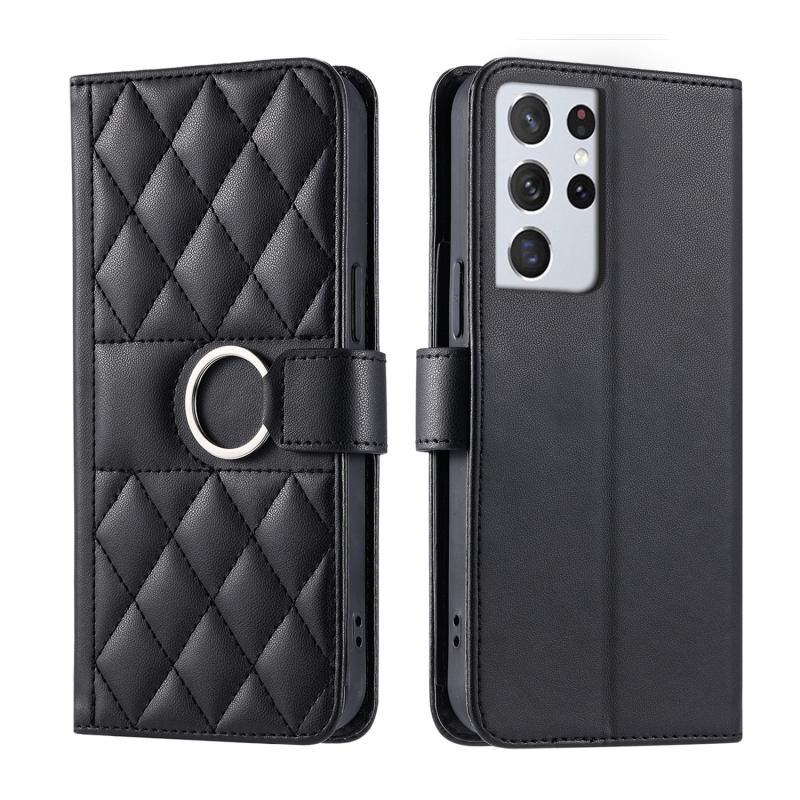 For Samsung Galaxy S21 Ultra 5G Ring Buckle Rhombic Leather Phone Case(Black)