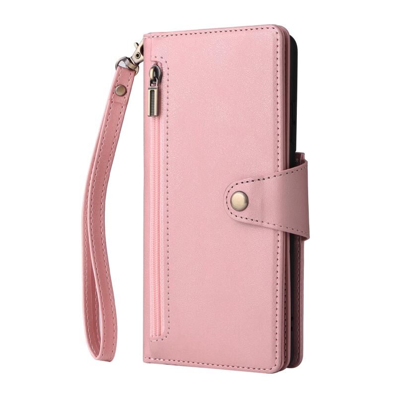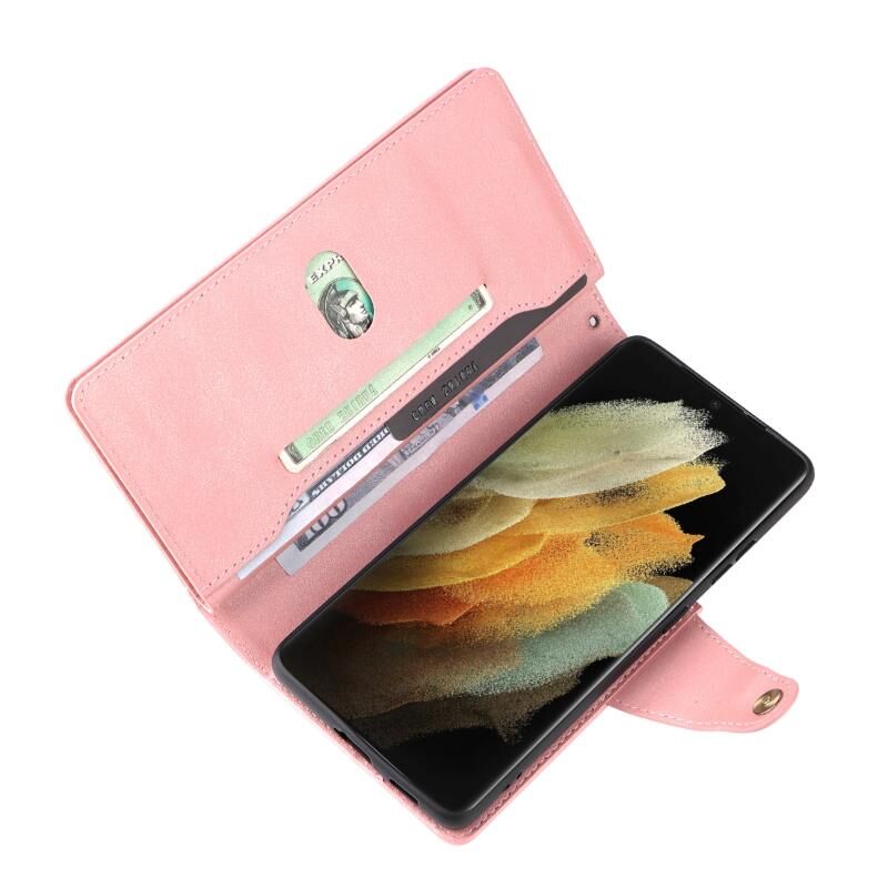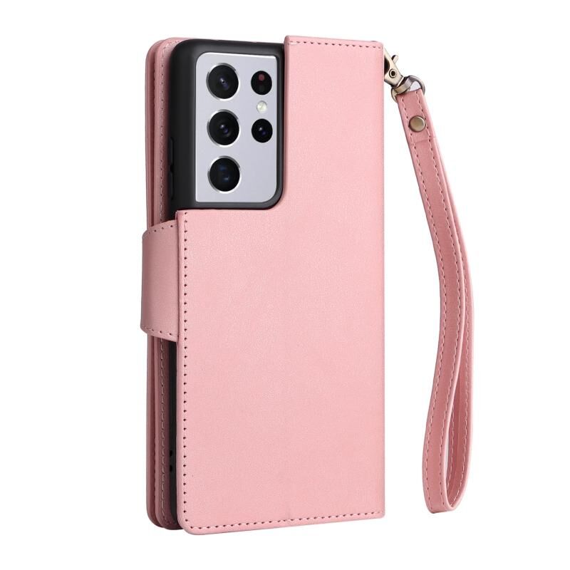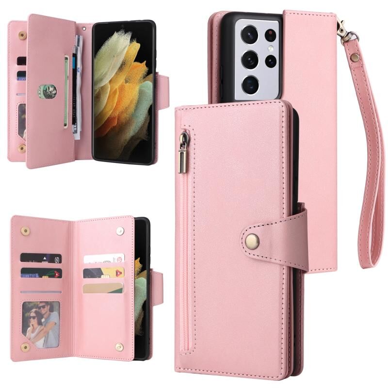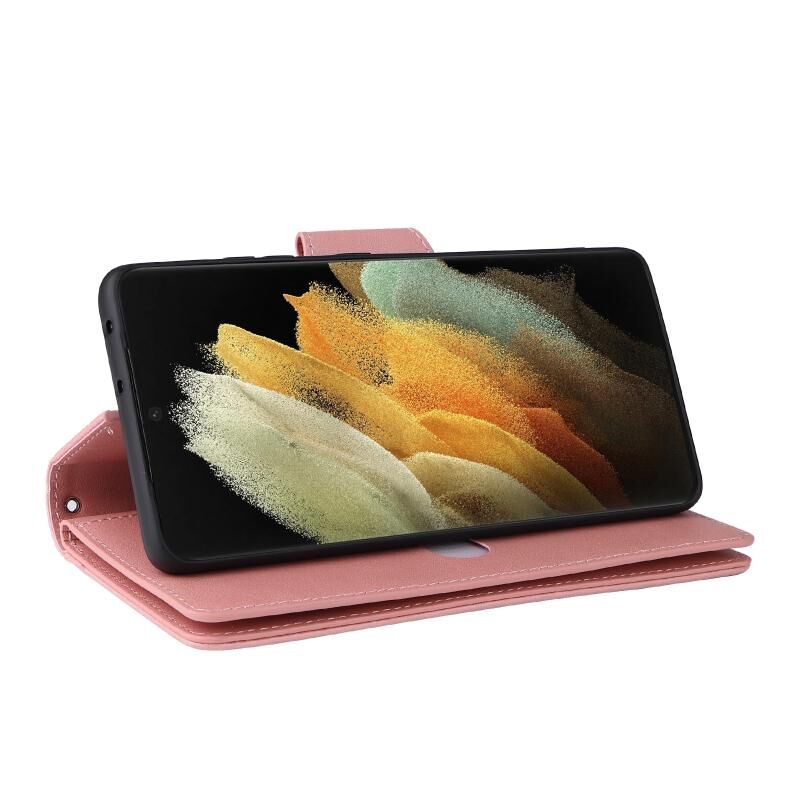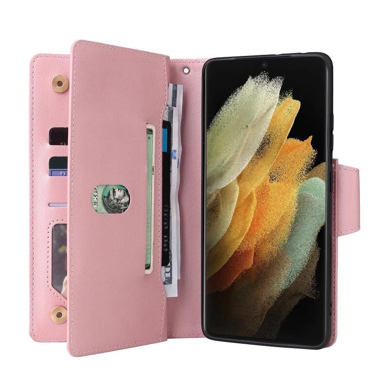 Για Samsung Galaxy S21 Ultra 5G Rivet πόρπη 9 κάρτες τρεις φορές δερμάτινη θήκη τηλεφώνου (ροζ χρυσό)