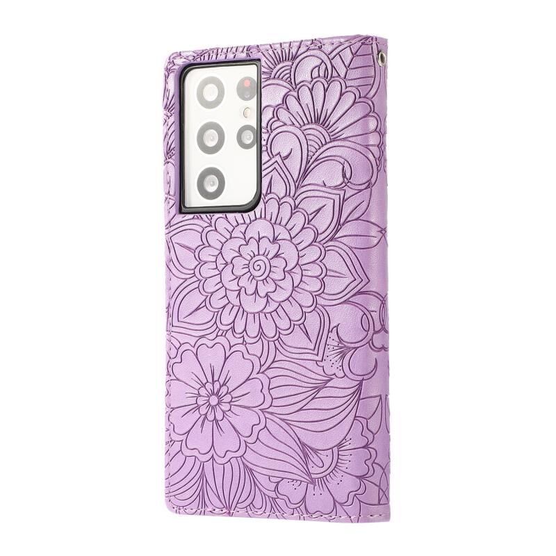 Για Samsung Galaxy S21 Ultra 5G Skin Feel ανάγλυφο ηλιοτρόπιο οριζόντια Flip δερμάτινη θήκη με θήκη & υποδοχές για κάρτες & πορτοφόλι & κορδόνι (μωβ)