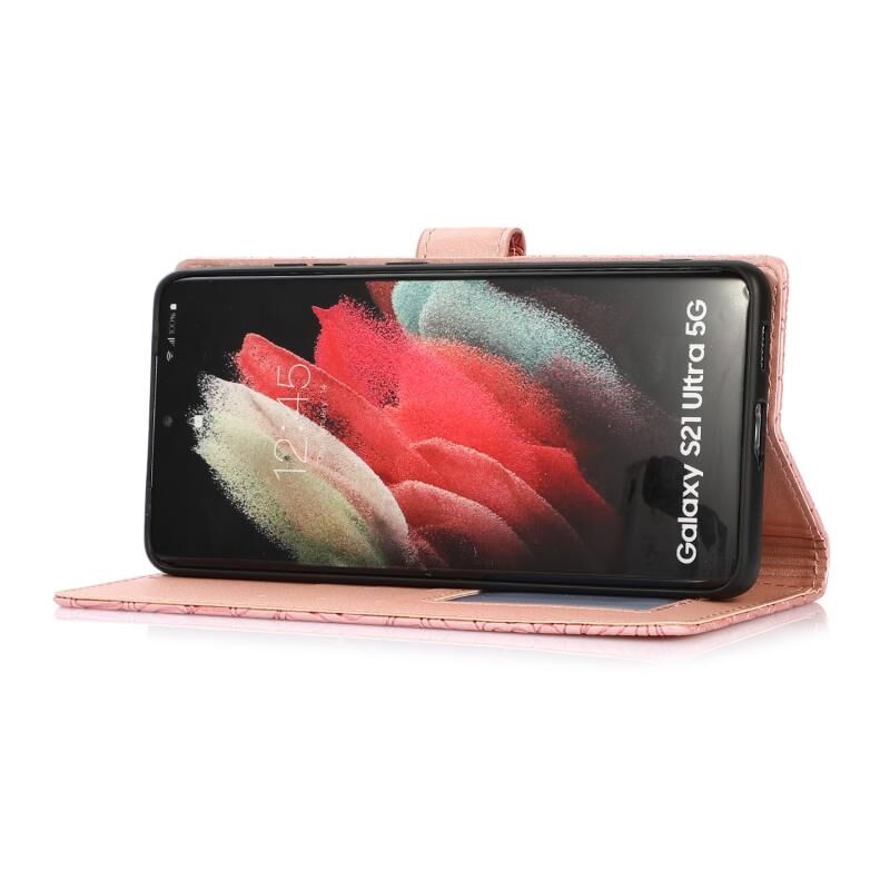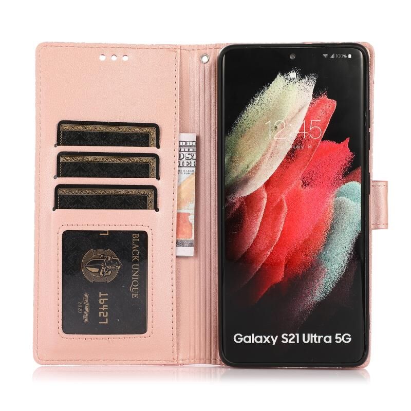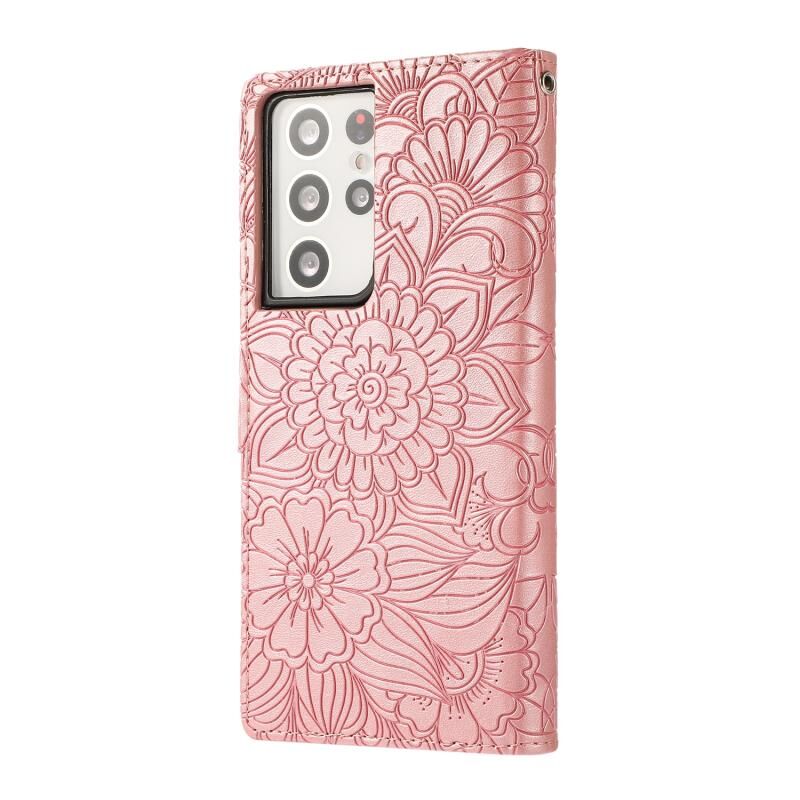 Για Samsung Galaxy S21 Ultra 5G Skin Feel ανάγλυφο ηλιοτρόπιο οριζόντια Flip δερμάτινη θήκη με θήκη & υποδοχές για κάρτες & πορτοφόλι & κορδόνι (Rose Gold)