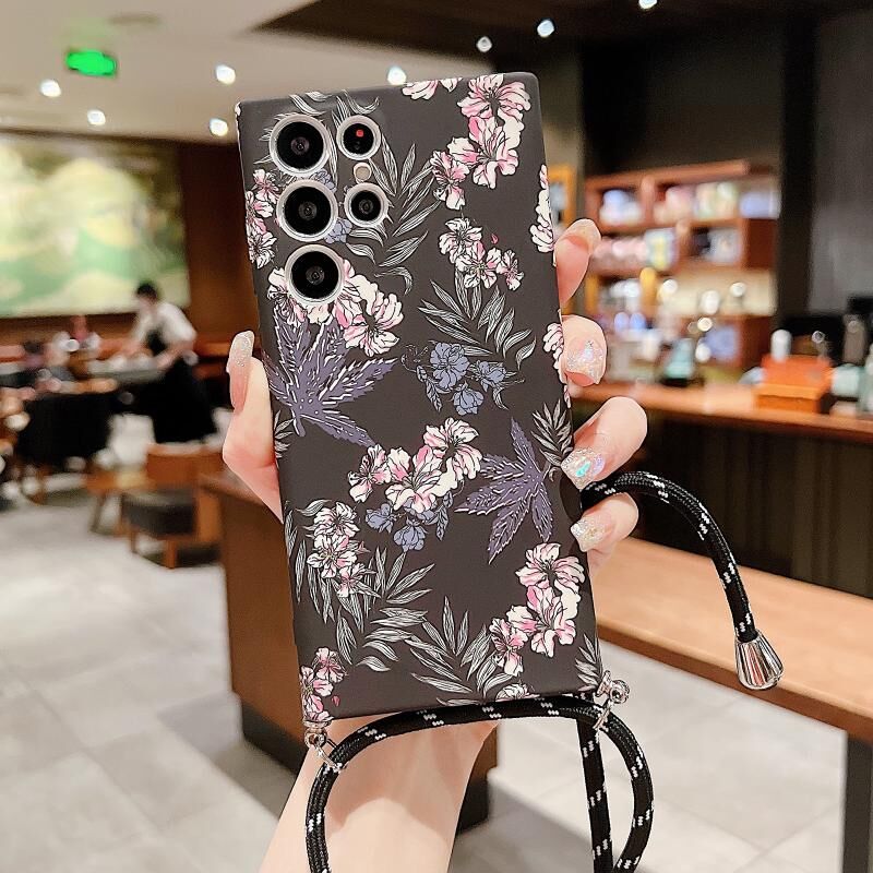 Θήκη τηλεφώνου με κορδόνι για Samsung Galaxy S21 Ultra 5G, μικρό λουλουδάτο σχέδιο (Μαύρο Κόκκινο Λουλούδι)
