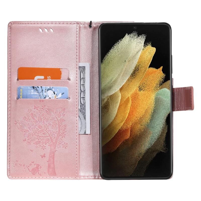 Για Samsung Galaxy S21 Ultra 5G Tree & Cat Pattern Pressed Printing Horizontal Flip PU Leather Case με θήκη & υποδοχές για κάρτες & πορτοφόλι & κορδόνι (Ροζ χρυσός)