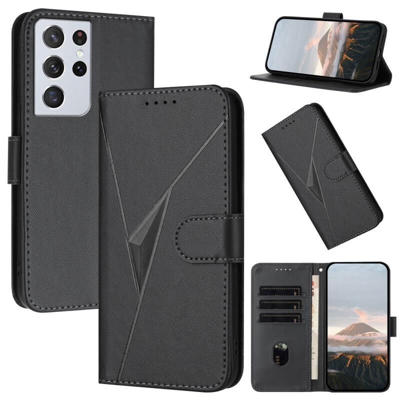 Για Samsung Galaxy S21 Ultra 5G Τρίγωνο μοτίβο αγκράφα κούμπωμα δερμάτινη θήκη τηλεφώνου (μαύρο)