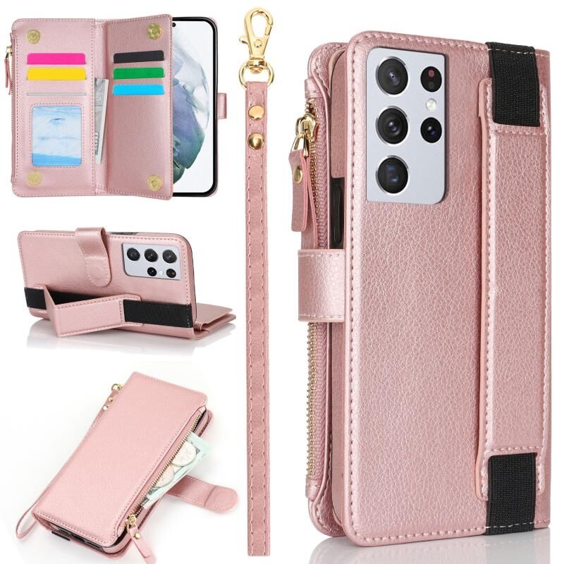 Για Samsung Galaxy S21 Ultra 5G Wristband κάτοχος φερμουάρ πορτοφόλι RFID δερμάτινη θήκη τηλεφώνου (Rose Gold)