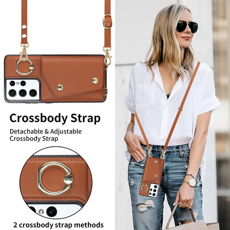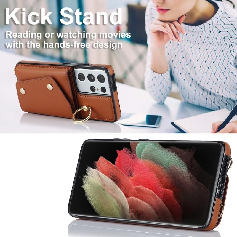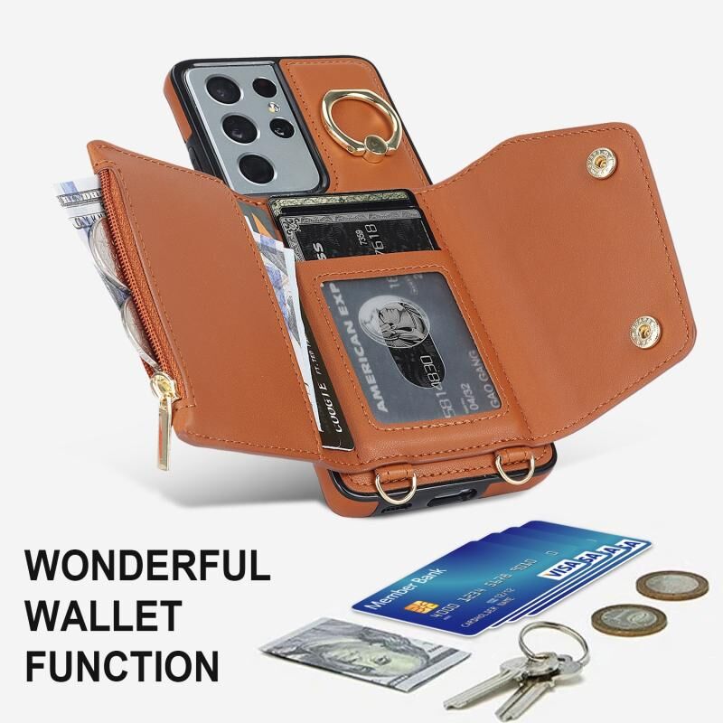 Για Samsung Galaxy S21 Ultra 5G φερμουάρ τσάντα κάρτα υπόθεση τηλεφώνου με διπλό κορδόνι (καφέ)