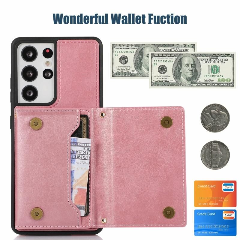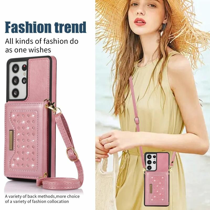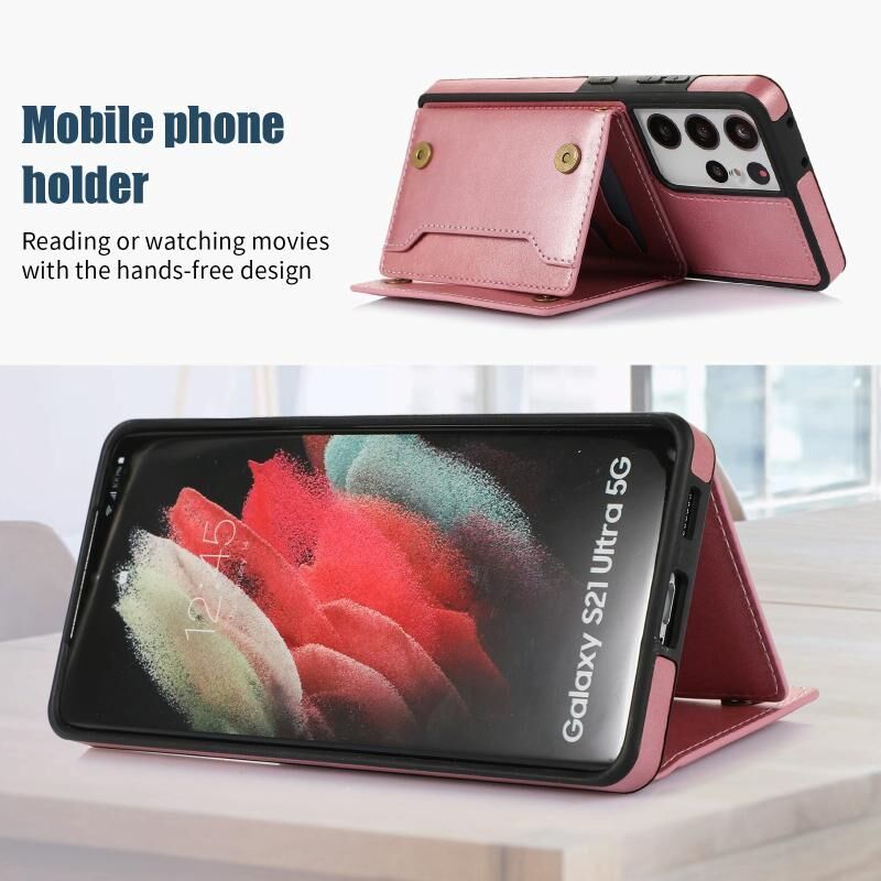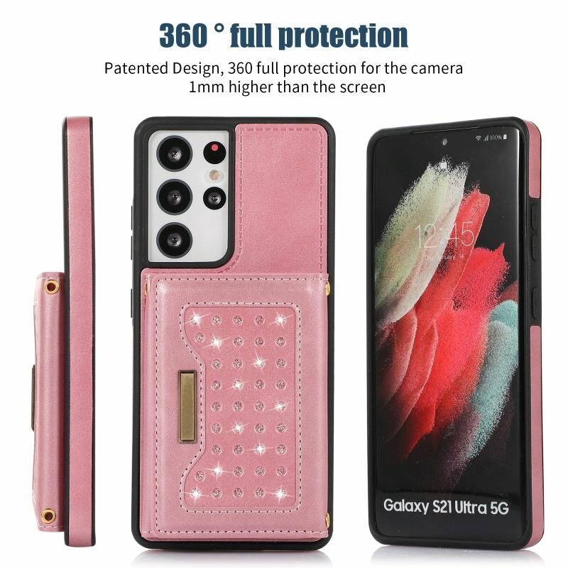 Για Samsung Galaxy S21 Ultra Τρεις φορές RFID δερμάτινη θήκη τηλεφώνου με κορδόνι (ροζ χρυσό)