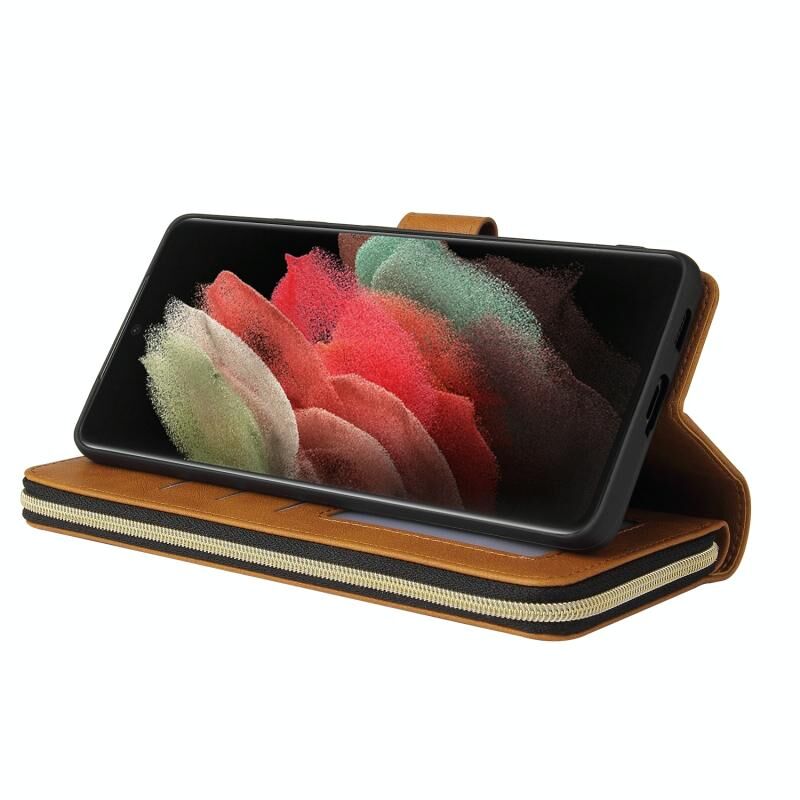 Για Samsung Galaxy S21 Ultra φερμουάρ τσάντα πορτοφόλι οριζόντια Flip PU δερμάτινη θήκη με θήκη & 9 υποδοχές για κάρτες & πορτοφόλι & κορδόνι & κορνίζα & κορνίζα φωτογραφιών (καφέ)