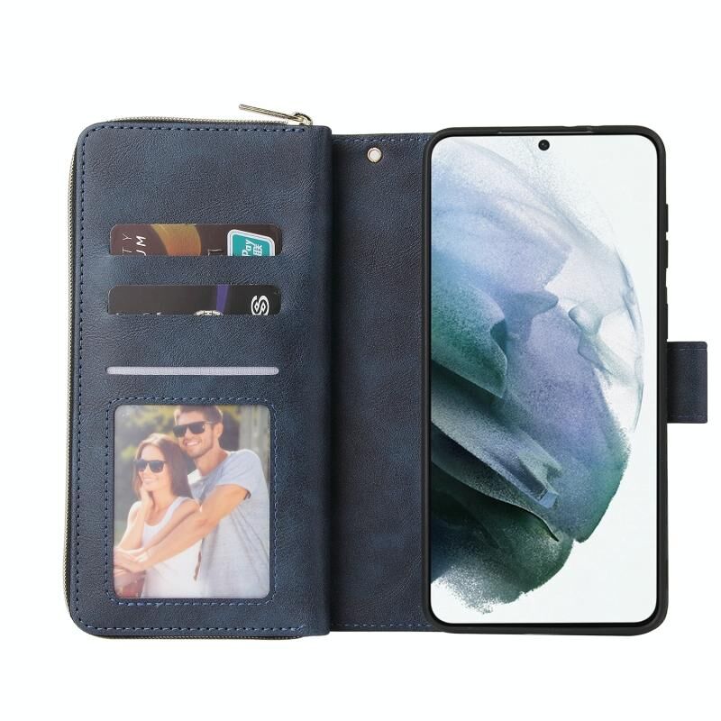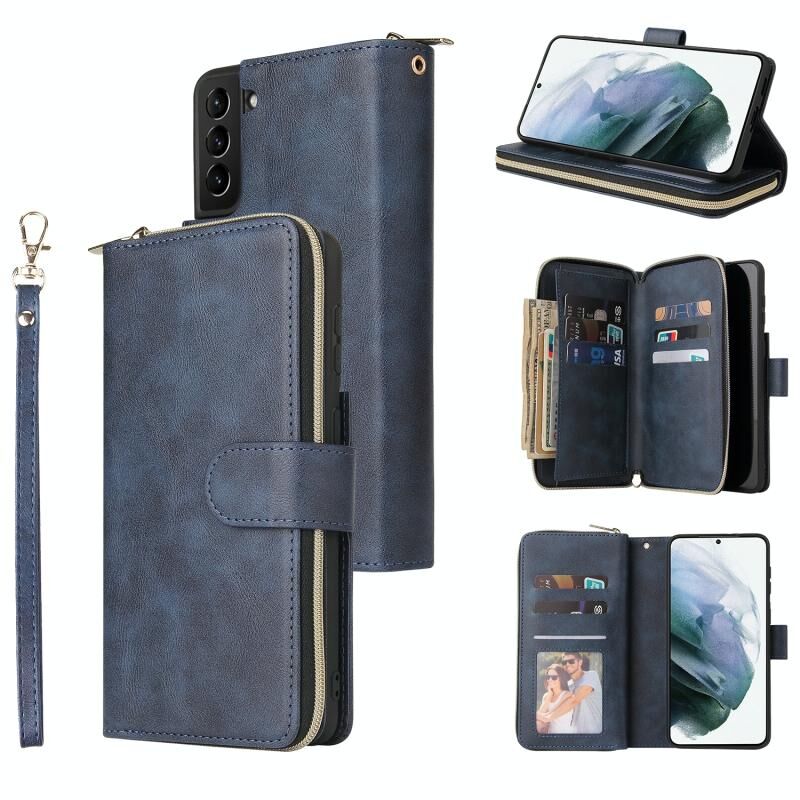 Για Samsung Galaxy S21+ φερμουάρ τσάντα πορτοφόλι οριζόντια Flip PU δερμάτινη θήκη με θήκη & 9 υποδοχές για κάρτες & πορτοφόλι & κορδόνι & κορνίζα & κορνίζα φωτογραφιών (μπλε)
