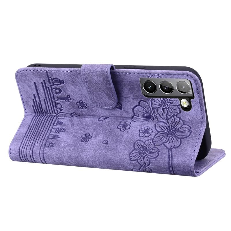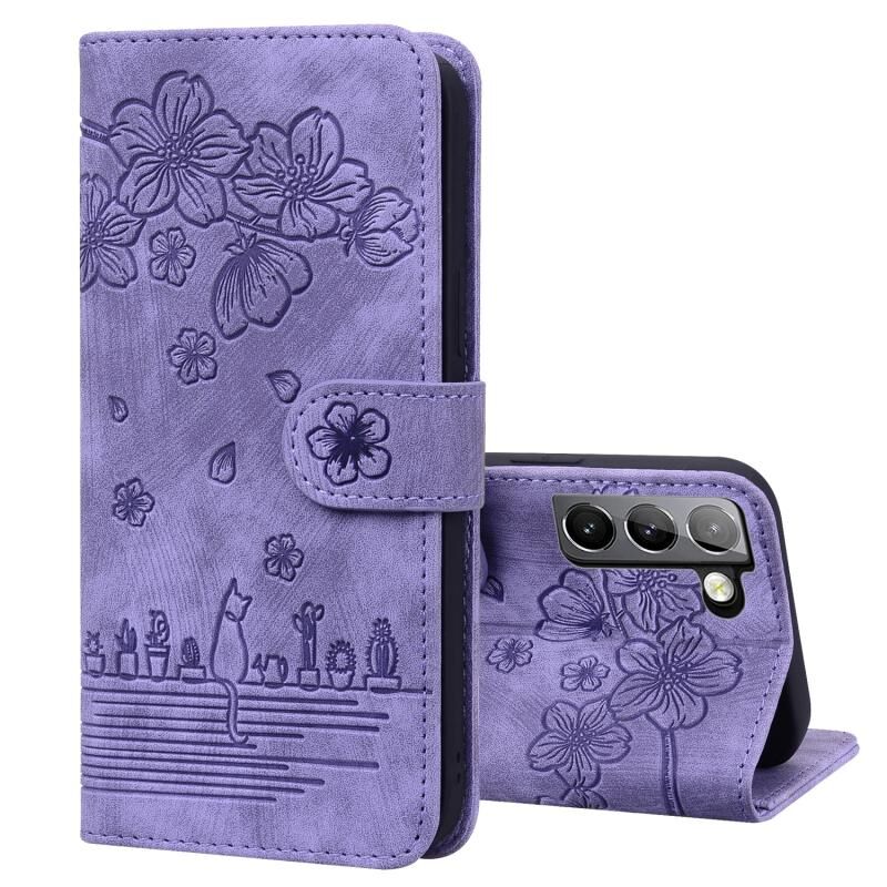 Θήκη τηλεφώνου Samsung Galaxy S22 5G από δέρμα με ανάγλυφο σχέδιο κινούμενων σχεδίων Sakura Cat (Μωβ)