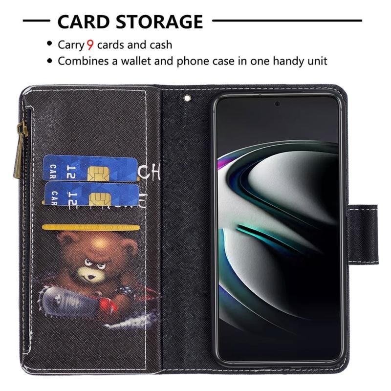 Θήκη τηλεφώνου Samsung Galaxy S22+ 5G από δέρμα με οριζόντιο άνοιγμα, φερμουάρ, πολύχρωμο σχέδιο και θήκη, υποδοχές για κάρτες και πορτοφόλι (Αρκούδα)