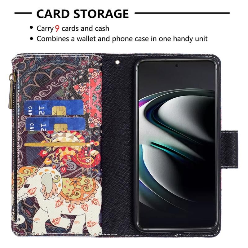 Θήκη τηλεφώνου Samsung Galaxy S22+ 5G από δέρμα με οριζόντιο άνοιγμα, φερμουάρ, πολύχρωμο σχέδιο, με βάση & θήκες για κάρτες & πορτοφόλι (Λουλούδια & Ελέφαντες)