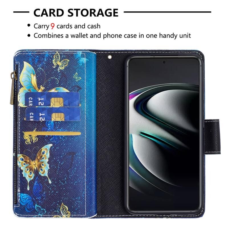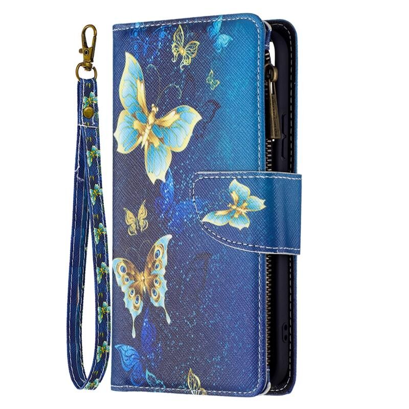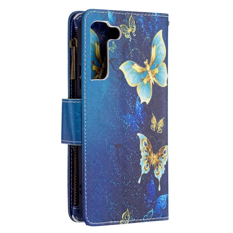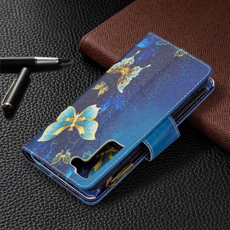 Θήκη δέρματος οριζόντιας αναδίπλωσης για Samsung Galaxy S22+ 5G με σχέδιο έγχρωμης ζωγραφικής, φερμουάρ, βάση στήριξης & υποδοχές καρτών & πορτοφόλι (Χρυσή Πεταλούδα)