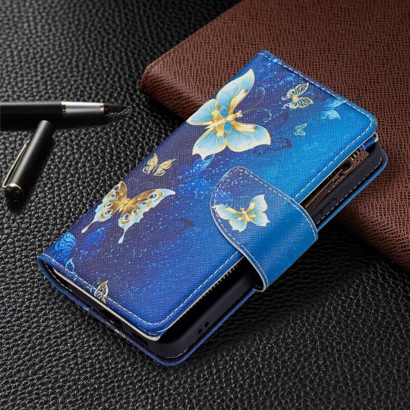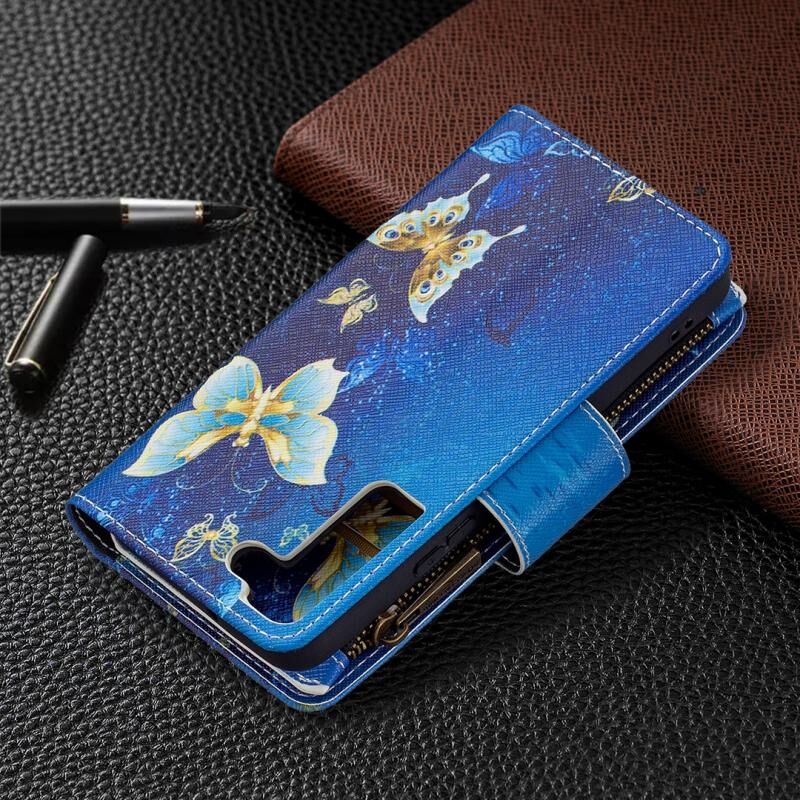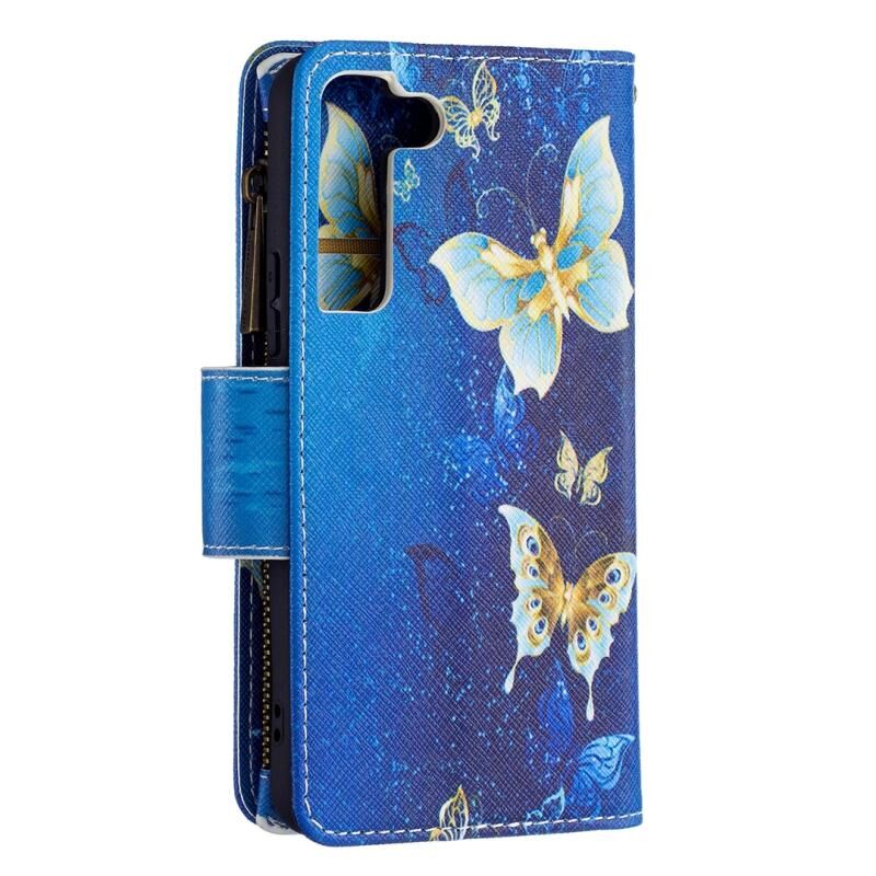 Θήκη τηλεφώνου Samsung Galaxy S22 5G δερμάτινη, οριζόντια, με φερμουάρ, σχέδιο ζωγραφικής με χρώματα, με βάση & θήκες για κάρτες & πορτοφόλι (Χρυσή Πεταλούδα)