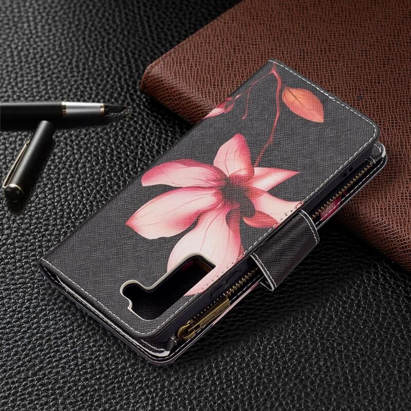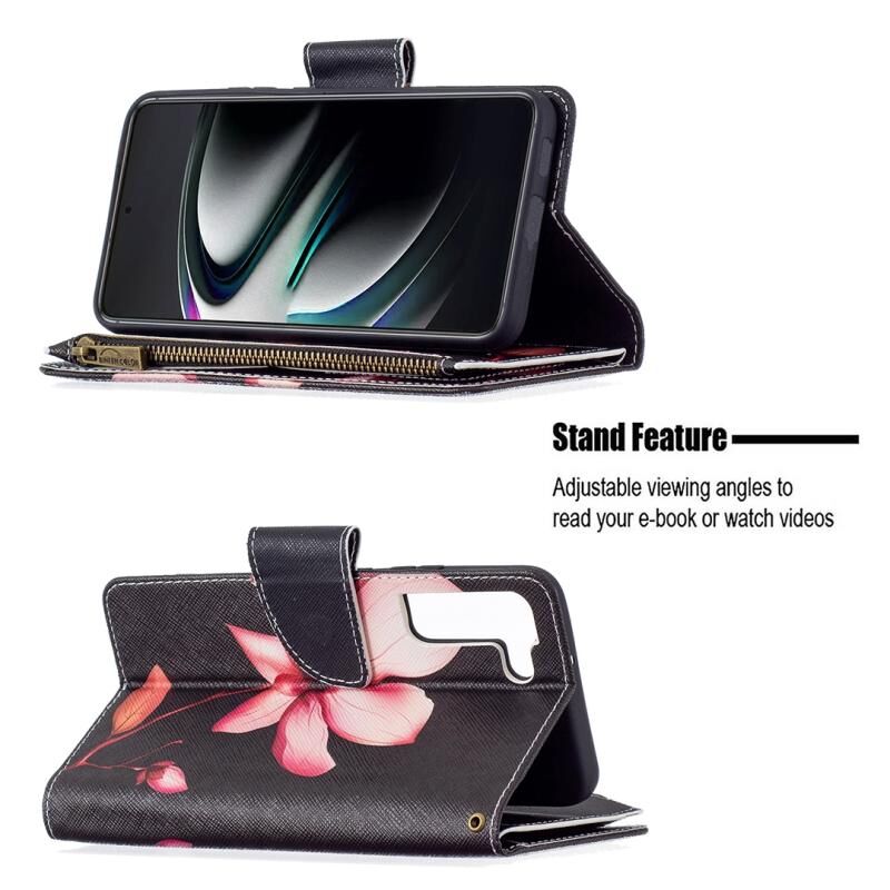 Θήκη δέρματος οριζόντιας αναδίπλωσης για Samsung Galaxy S22+ 5G με έγχρωμο σχέδιο, φερμουάρ, βάση στήριξης & θήκες για κάρτες & πορτοφόλι (Λωτός)
