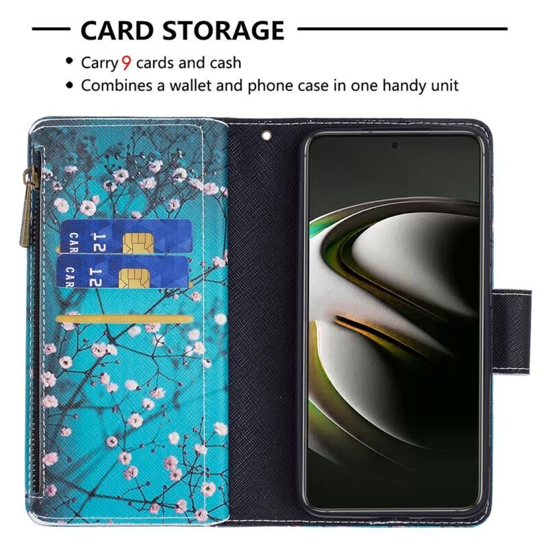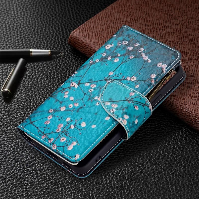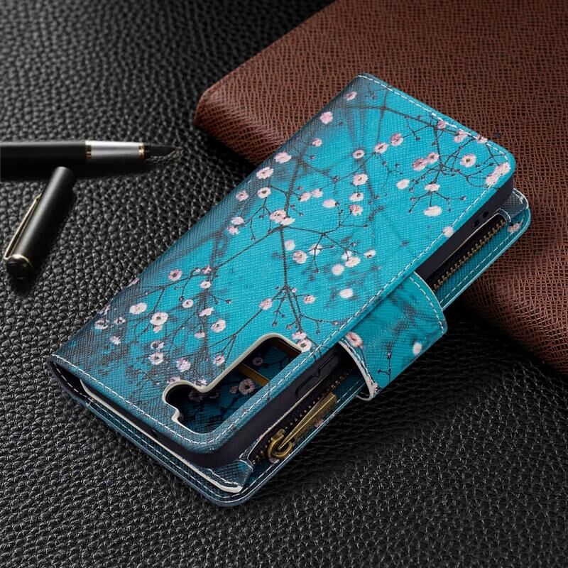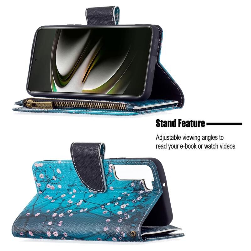 Θήκη δέρματος οριζόντιας αναδίπλωσης για Samsung Galaxy S22 5G με σχέδιο έγχρωμης ζωγραφικής, φερμουάρ, βάση στήριξης & υποδοχές καρτών & πορτοφόλι (Λουλούδι Δαμασκηνιάς)