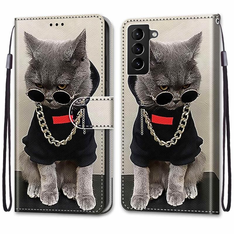 Θήκη τηλεφώνου Samsung Galaxy S22+ 5G από δέρμα PU με οριζόντιο άνοιγμα, πολύχρωμο σχέδιο με ανάγλυφη υφή, με βάση, θήκες καρτών, πορτοφόλι και κορδόνι (Πολύχρωμο στρώμα (Χρυσή αλυσίδα, Γκρίζο Γάτα))