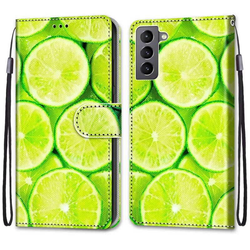 Θήκη τηλεφώνου Samsung Galaxy S22 5G από δέρμα PU με οριζόντιο άνοιγμα, ανάγλυφη υφή, πολύχρωμο σχέδιο (Lime), με βάση, θήκες καρτών, πορτοφόλι και κορδόνι.