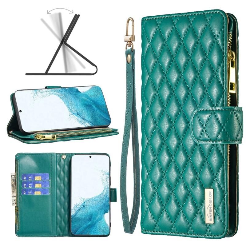 Θήκη τηλεφώνου Samsung Galaxy S22+ 5G, Δερμάτινη θήκη τύπου πορτοφολιού με φερμουάρ και σχέδιο διαμαντόπετρας (Λευκό)