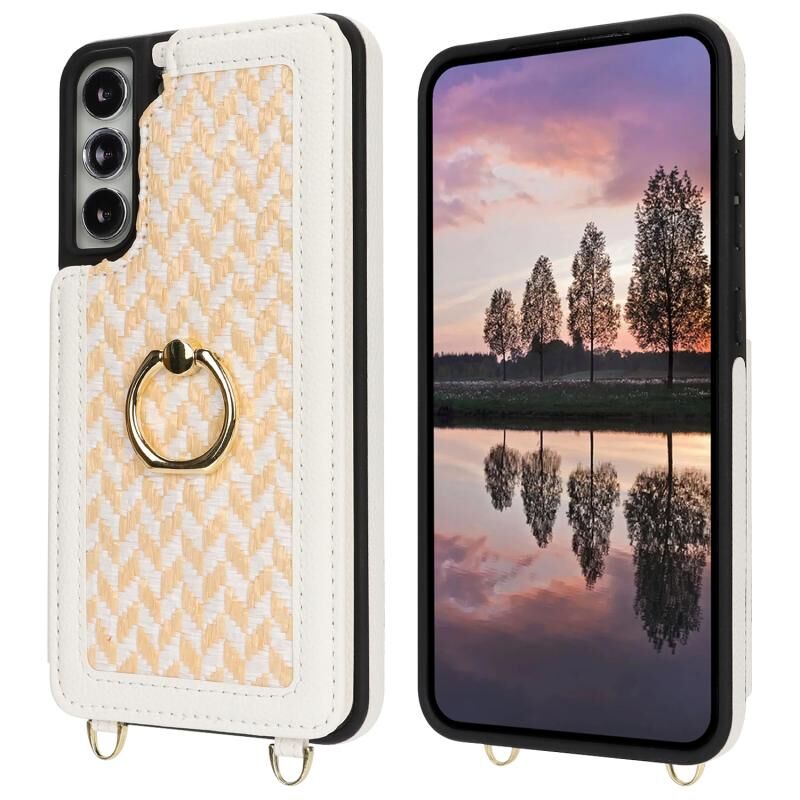 For Samsung Galaxy S22 5G Double Bckle Card Slot Full Coverage Phone Case with Cross-body Strap(White)