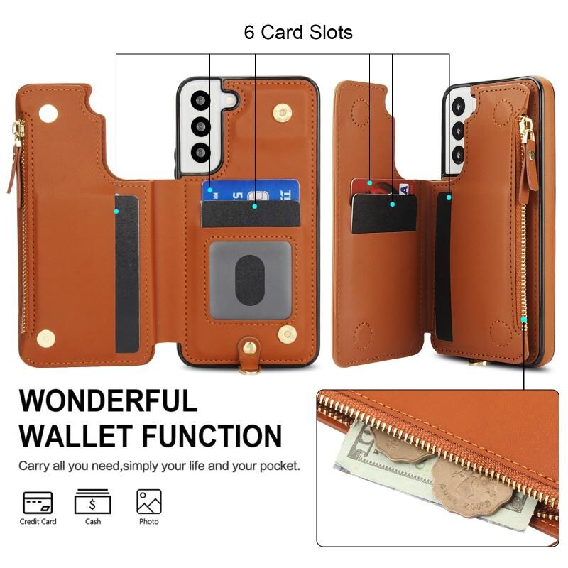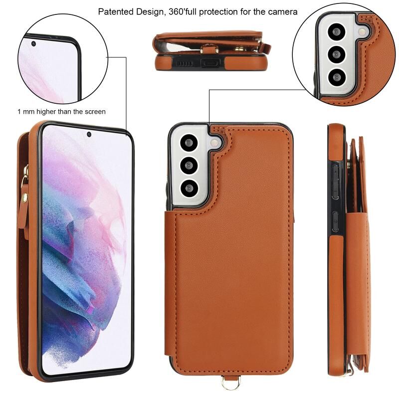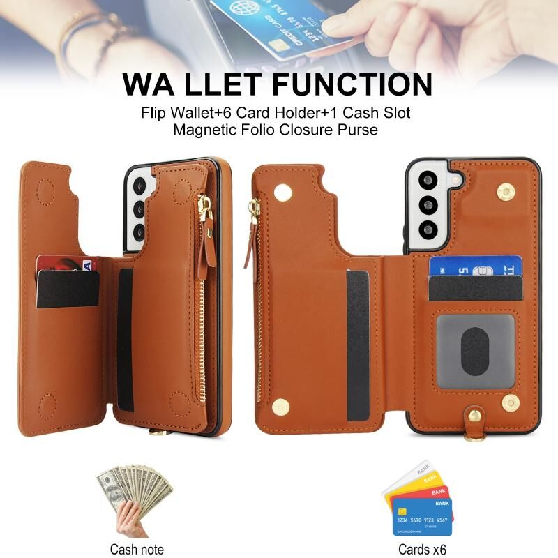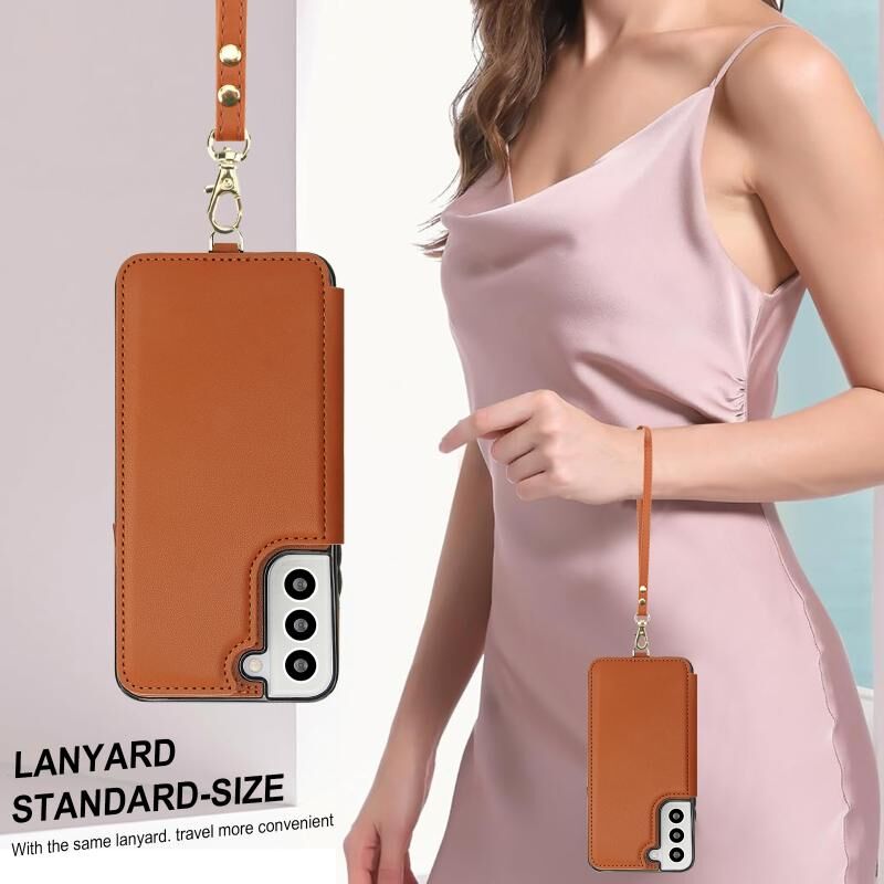 For Samsung Galaxy S22+ 5G Double Flap Zipper RFID Leather Phone Case with Short Lanyard(Brown)