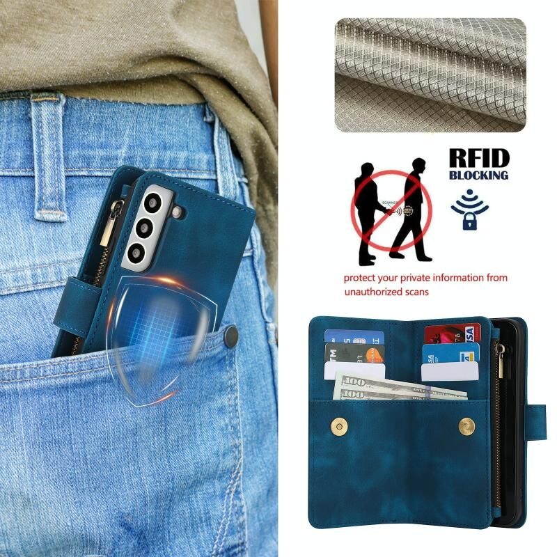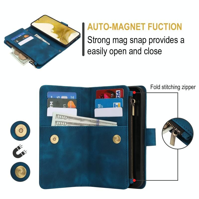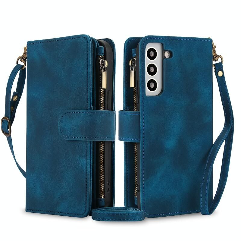 Για Samsung Galaxy S22 5G Dream 9-Card φερμουάρ πορτοφόλι RFID δερμάτινη θήκη τηλεφώνου με κορδόνι (μπλε)