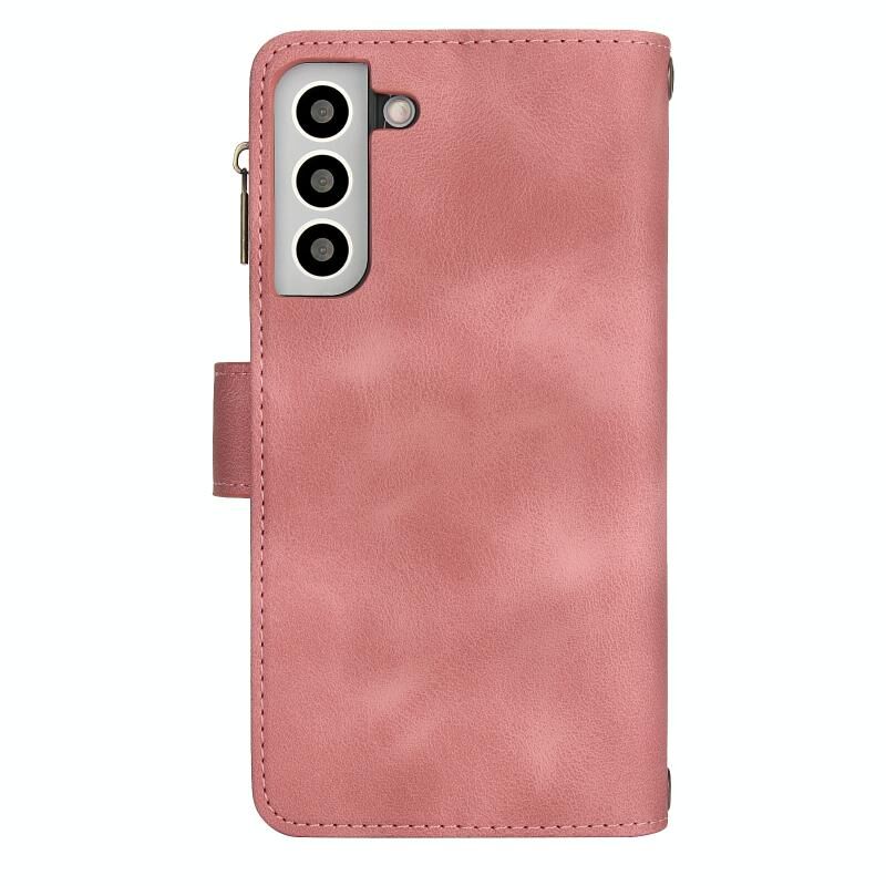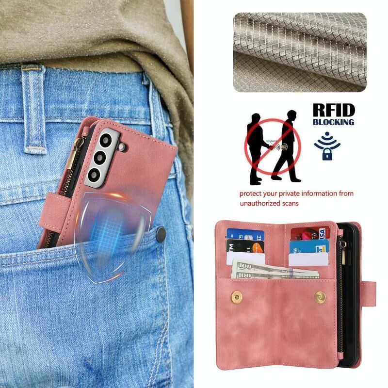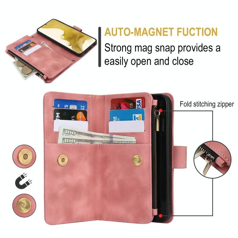 Για Samsung Galaxy S22 + 5G Dream 9-Card φερμουάρ πορτοφόλι RFID δερμάτινη θήκη τηλεφώνου με κορδόνι (Rose Gold)
