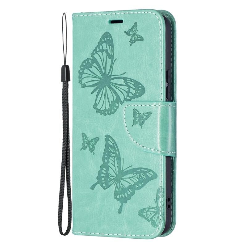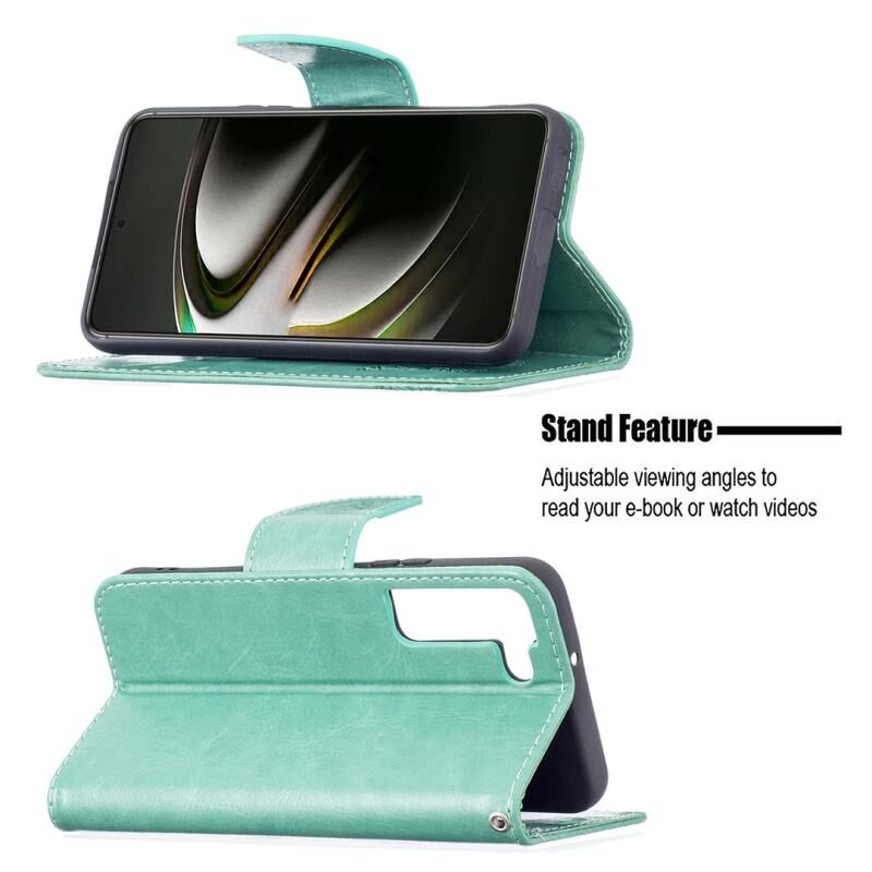Θήκη τηλεφώνου δερμάτινη με ανάγλυφο σχέδιο δύο πεταλούδων για Samsung Galaxy S22 5G, με βάση στήριξης, θήκη καρτών, πορτοφόλι και λουρί (Μωβ)