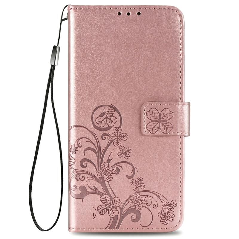 Για Samsung Galaxy S22 5G Four-leaf Clasp ανάγλυφη δερμάτινη θήκη τηλεφώνου με κορδόνι & υποδοχή για κάρτες & πορτοφόλι & λειτουργία βραχίονα (Rose Gold)