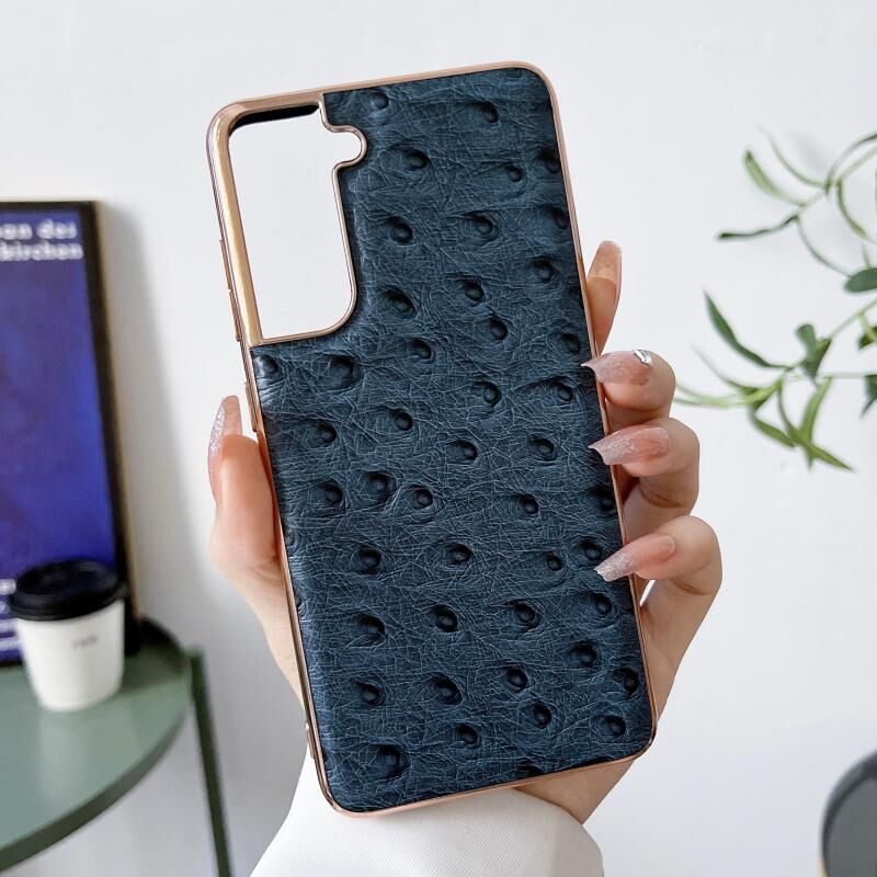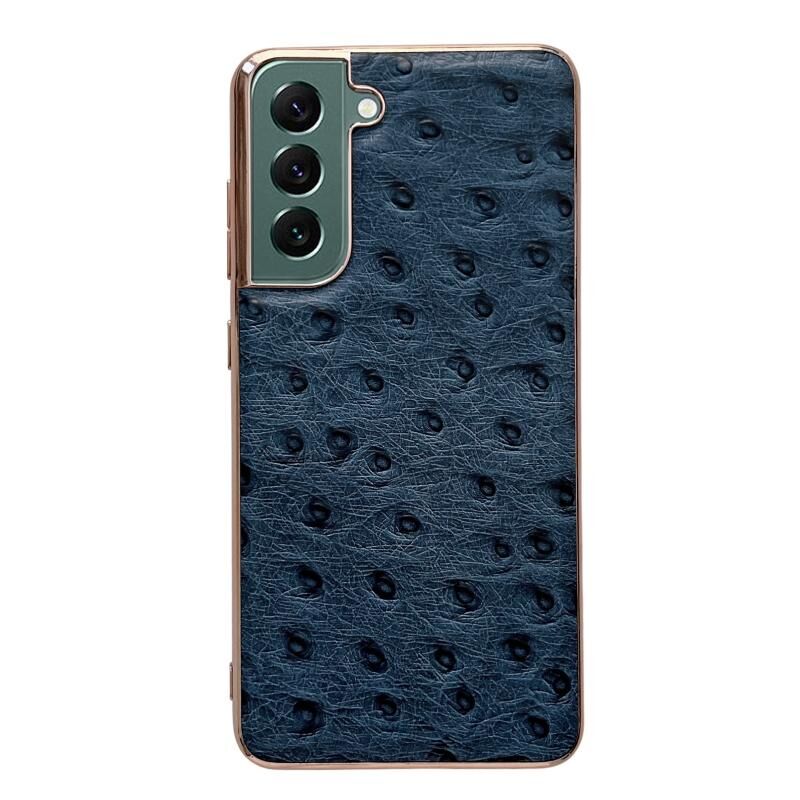 Θήκη τηλεφώνου Samsung Galaxy S22+ 5G από γνήσιο δέρμα με υφή στρουθοκάμπου, σειρά νανο-επίχρυσης (Μπλε)